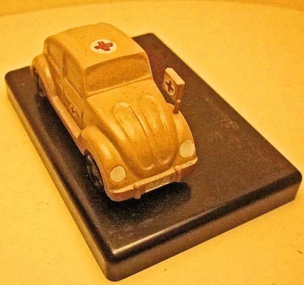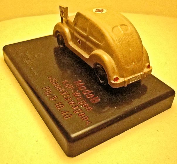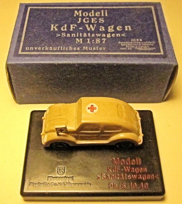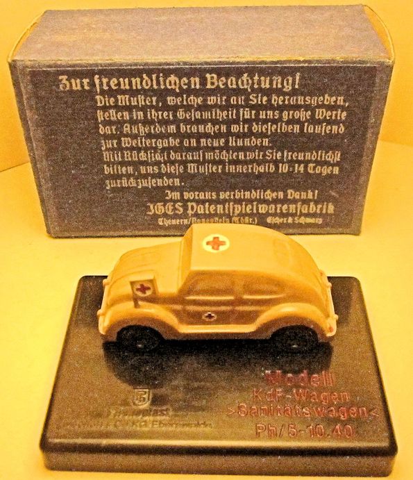 The second set with the name of Sanitätswagen (ambulance) has only one KdF Wagen, yellow-cream color, which is the same as in the first set. The JGES KdF Wagen is mounted on a brown square Bakelite base with lettering stating Modell, KdF Wagen, < Sanitätswagen>, PH/6-10.40 and the Phenoplast logo.