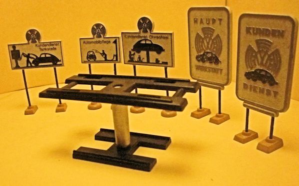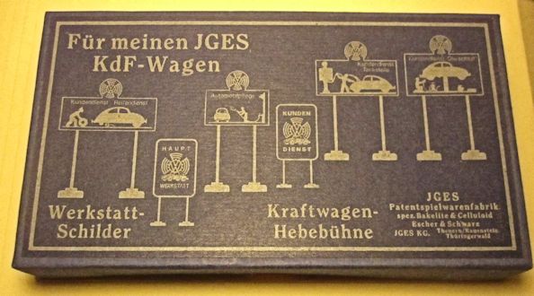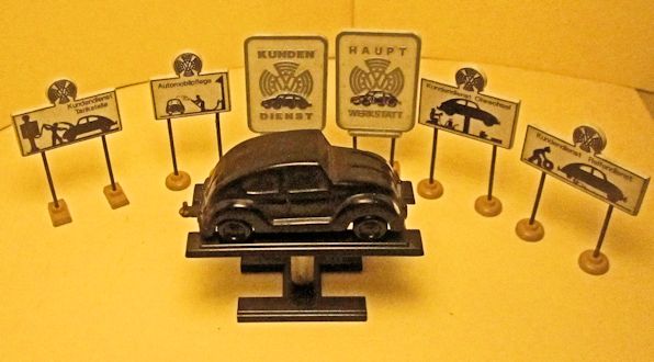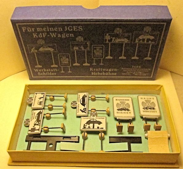 This Für meinen JGES KdF WAGEN accessory set was designed to be used with the JGES KdF Wagen. The set included 6 Werkstatt-Schilders (service station signs) and a Hebebühne (car lift). The signs depicted the KdF Wagen getting service with a tire change, washing, engine repair and fueling. Two signs indicated the main service and repair location. The car lift could be raised and lowered and could have a JGES MEIN KdF WAGEN sitting on top of the lift for service. The accessory set did not include the JGES KdF WAGEN.