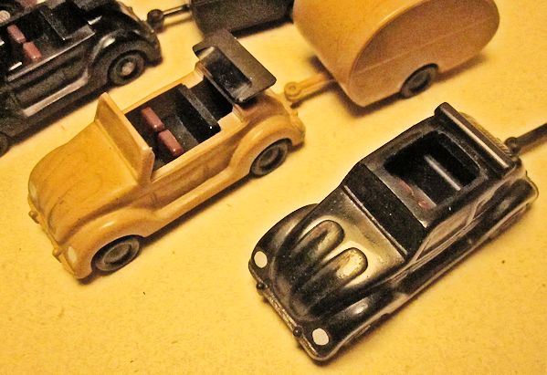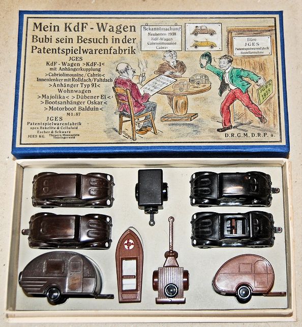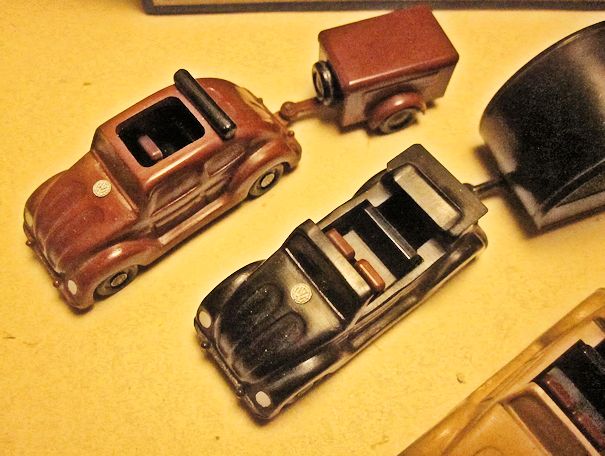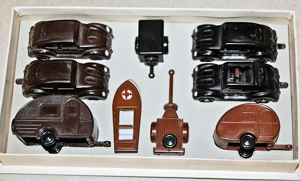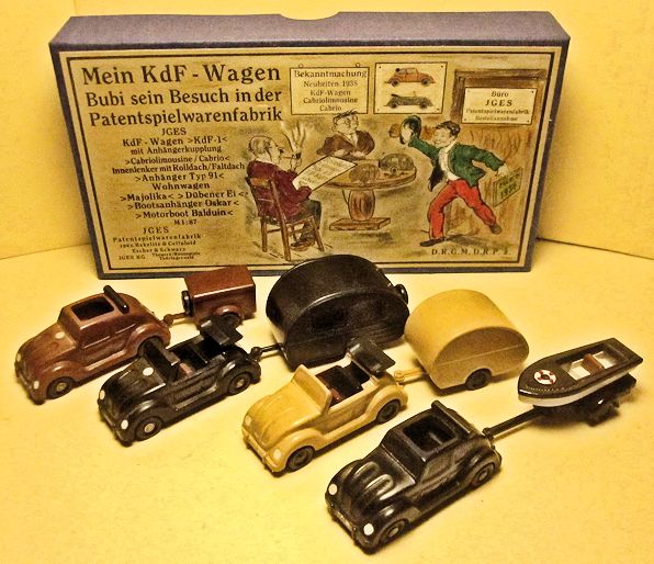 A similar set included 2 dark brown Kdf Wagen Sedans with only 1 having a tow hook. Also a black KdF Wagen Sedan and a Cabrio both with a tow hook. This set also included a cargo trailer, both large and small camping trailers and a boat trailer.