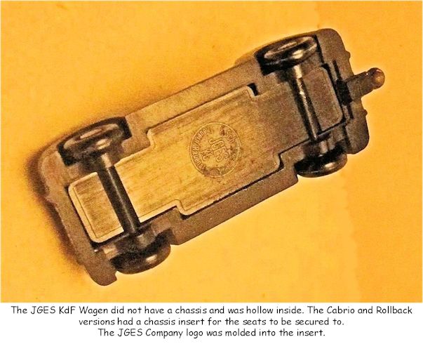 The JGES KdF Wagen did not have a chassis and was hollow inside. The Cabrio and Rollback versions had a chassis insert for the seats to be secured to. The JGES Company logo was molded into the insert.