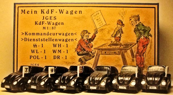 The JGES KdF Kommandeurwagen was black and had a flag as part of the drivers fender. The flag had an insignia of the organization it represented. The front and rear bumpers had license plate numbers such as SS-1, WH-1, WL-1, WM-1, POL-1 or DR-1. There was a dab of white paint for the headlights and red paint for the taillights.