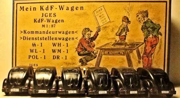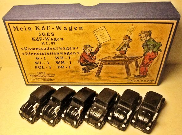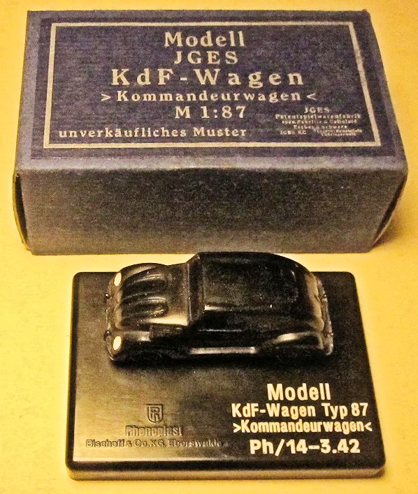 A single JGES Kommandeurwagen was included in a special box. The Kommandeurwagen is mounted on a black square Bakelite base with lettering stating Modell, KdF Wagen Typ 87,< Kommandeurwagen >, PH/14-3.42 and the Phenoplast logo. The box contained the message "Unverkaufliches Muster", which means SAMPLE, NOT FOR SALE.