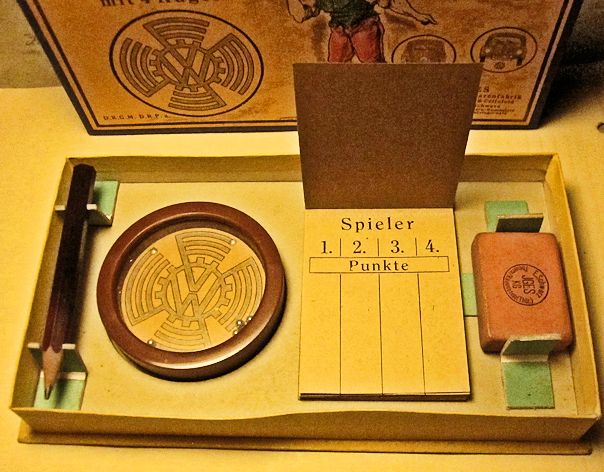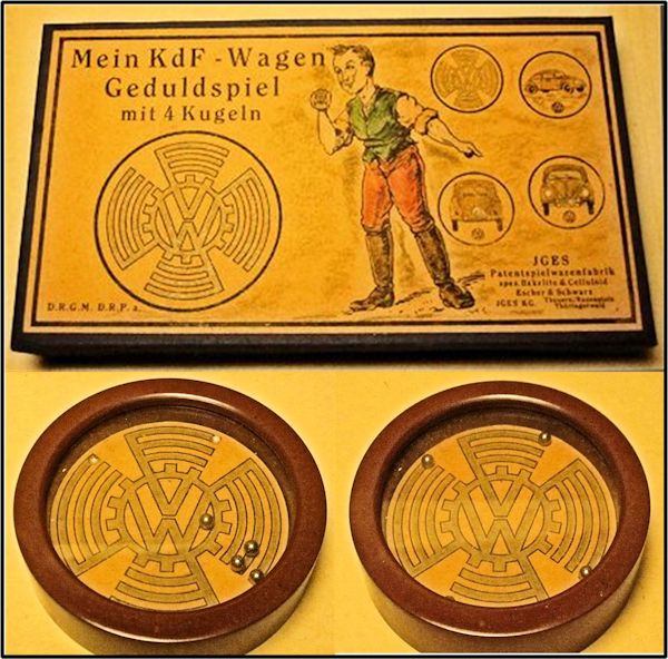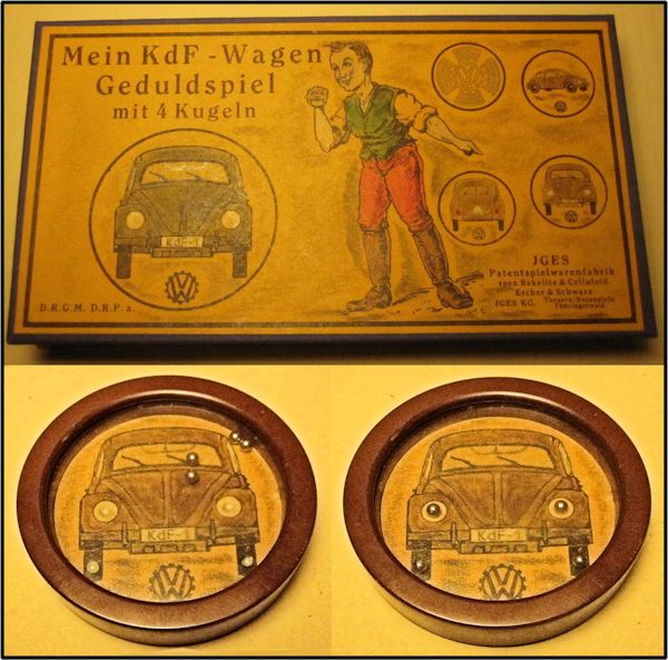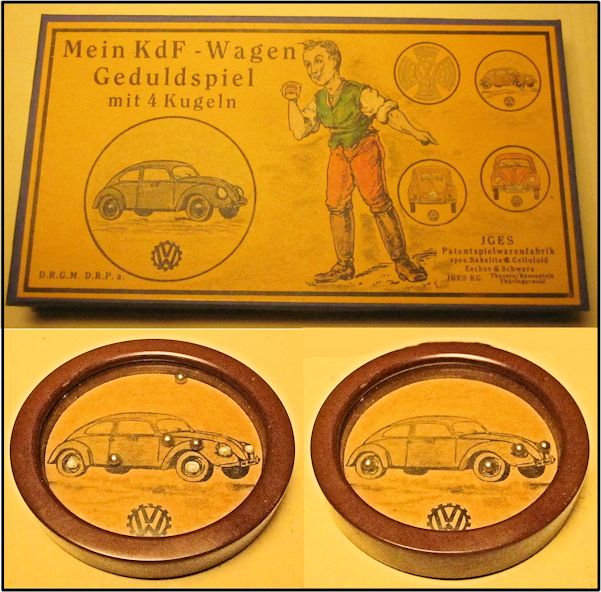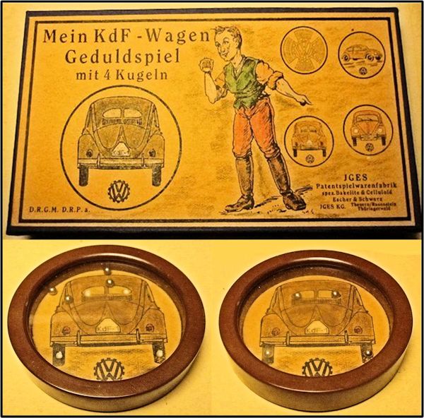 This JGES MEIN KdF WAGEN is a Geduldspiel or puzzle in a small round Bakelite container. It came in 4 different sets and each set included a puzzle, pencil, score card and an eraser. The puzzle had a frontview of a KdF Wagen era picture inside the Bakelite container with 4 small holes and 4 metal balls. Also a version with just the VW logo with cogwheel, a KdF Wagen from sideview and a KdF Wagen from rearview. The object of the game was to move the 4 balls until they each landed into a small hole on the picture. Not sure how the scoring was determined.