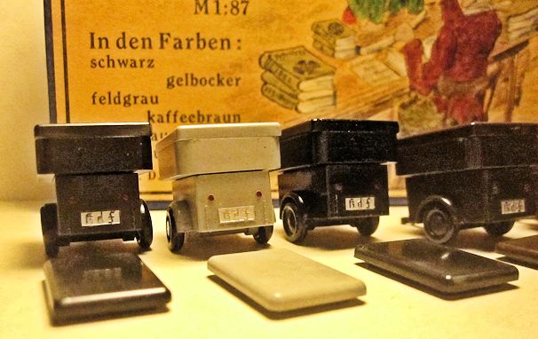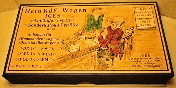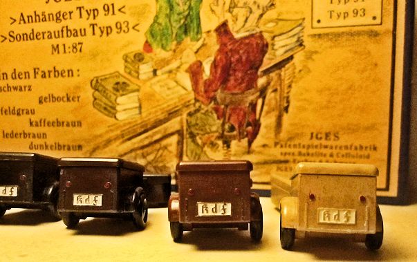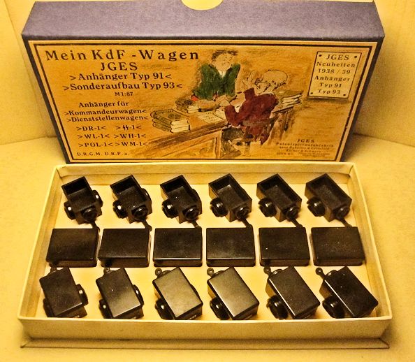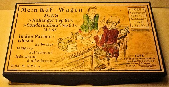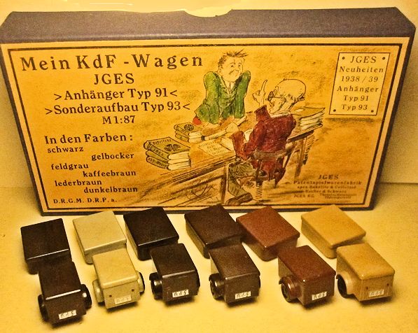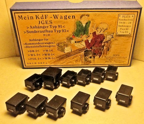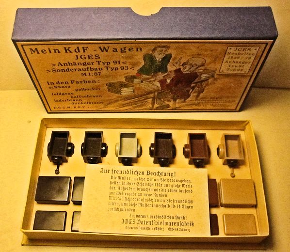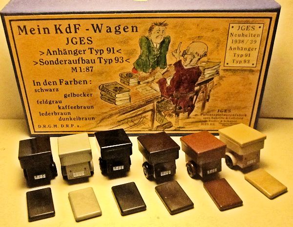 The JGES MEIN KdF WAGENS that were equipped with an anhängerkupplung (or tow bar) had a couple of JGES accessory items that could be towed. The box came with six trailers with two different size tops, low or high and a spare tire. The six trailer colors, Yellow-Cream, Black, Leather-brown, Dark-Brown, Coffee-Brown, Field Grey, were the same as the KdF Wagens. The rear of the trailer had a white license plate number of KdF. These trailers were commonly used for the Postal services, the Red Cross, etc.