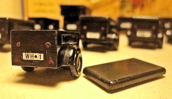 There were 6 each of the high and low trailer tops for the 12 trailers. All of the trailers and tops were black in this set. The rear of the trailer had a license plate numbers such as SS-1, WH-1, WL-1, WM-1, POL-1 or DR-1. There was a dab of red paint for the taillights.
