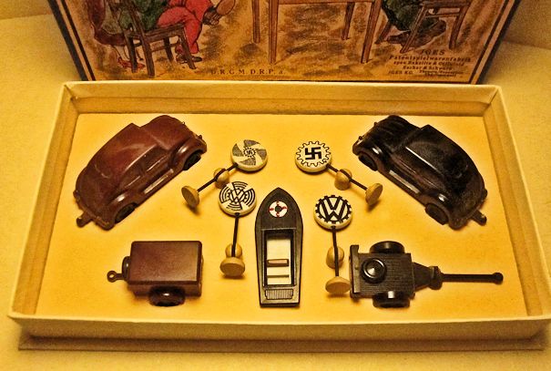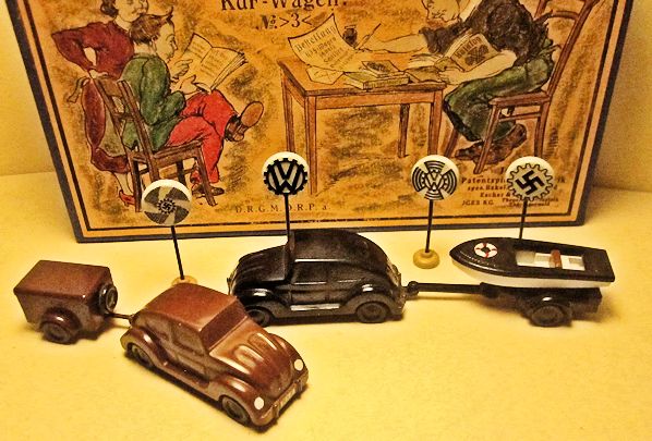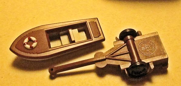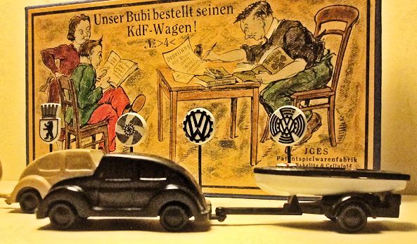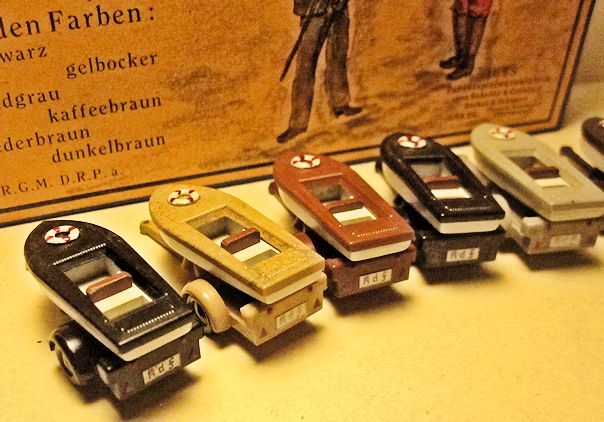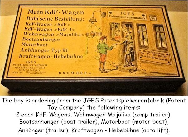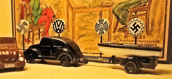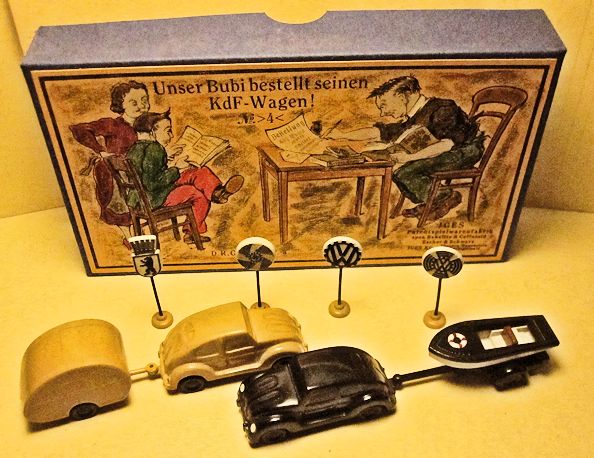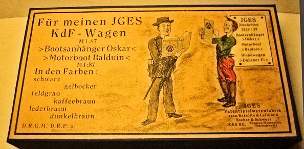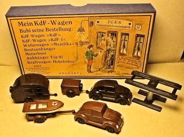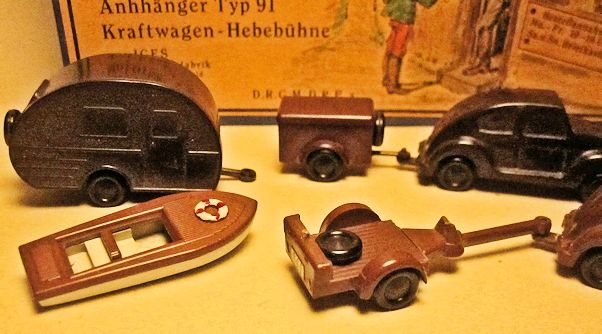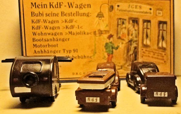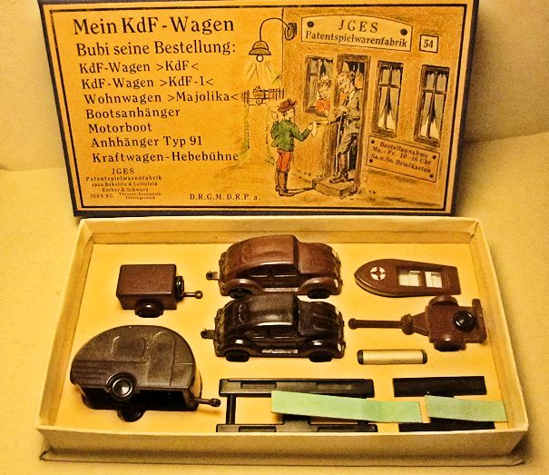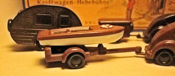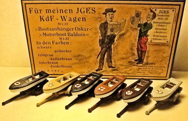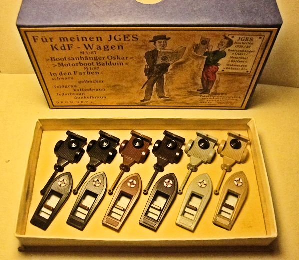 The JGES MEIN KdF WAGEN was available as a set with an Anhängerkupplung or tow bar, trailer and boat. There were several different type of sets produced with one set being only boats. Some sets included a camp trailer, road signs or a hebebühne or lift. All of the sets came in the six basic colors of yellow-cream, black, leather-brown, dark-brown, coffee-brown, field grey. The rear of the boat trailer had a white license plate with “KdF” lettering.