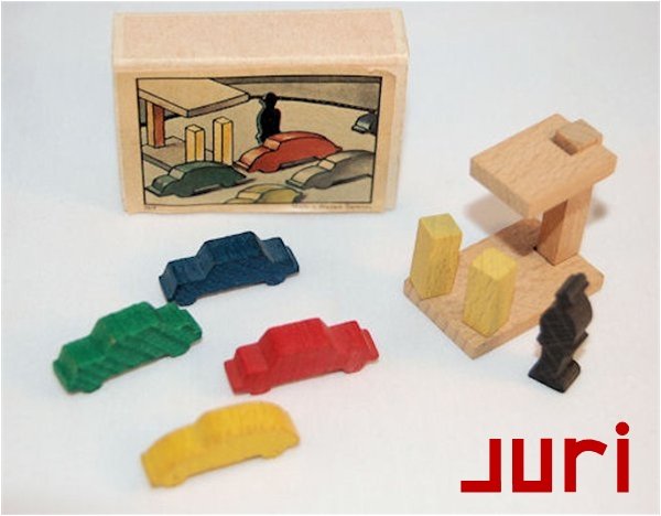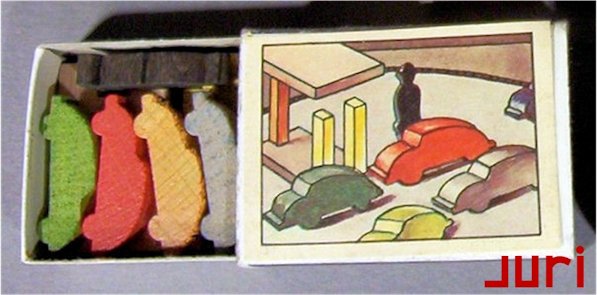 The JURI Company (Holz Spielwaren Horst Richardt Gmbh & Co. KG, Nordhorn, Germany) produced a lot of different wooden toys. They also produced a series of matchboxes filled with farms, animals, a zoo, houses, but also a version with a service station. It consisted of several wooden parts that formed the service station, a service man and 4 cars. In some boxes one finds 4 different colored VW Beetles, in others also other car makes were included. In the early 60’s a second version was issued that consisted of 4 different makes of cars (1 VW Beetle) and in the late 60’s, early 70’s even a 3rd version with VW Beetles and the skyline of a large city was produced.