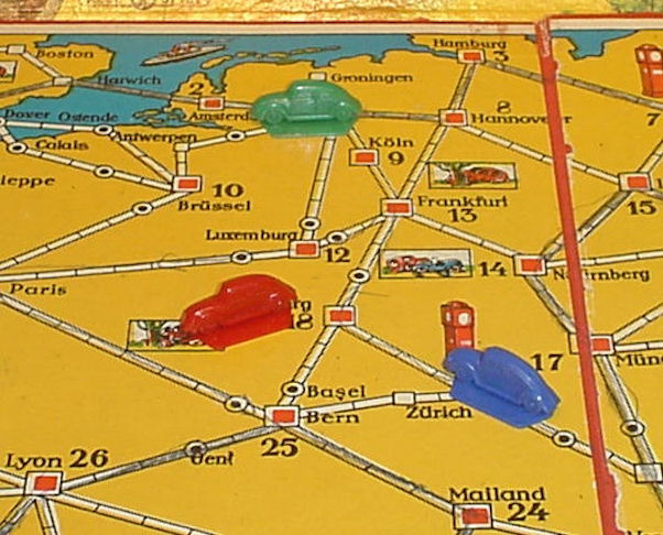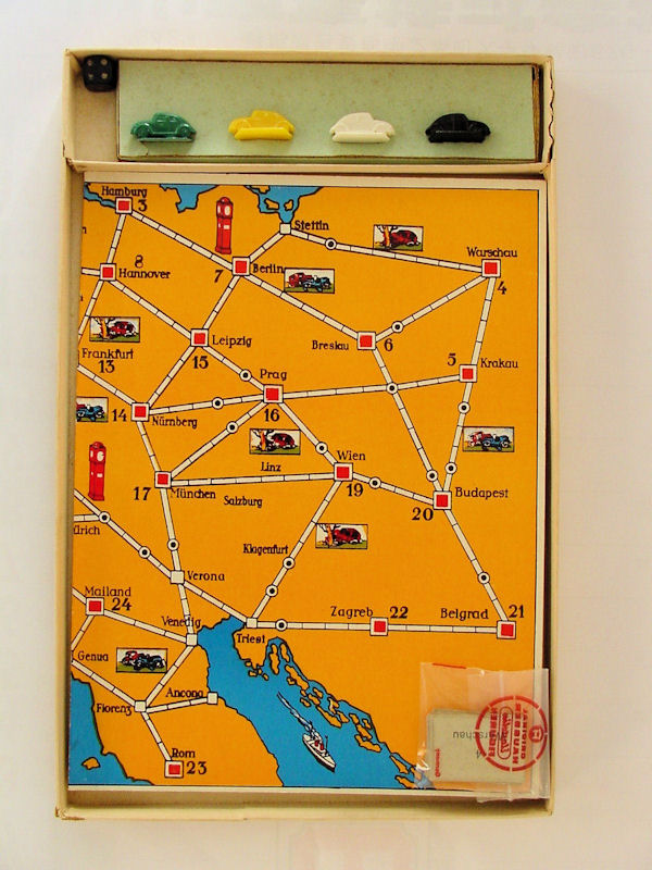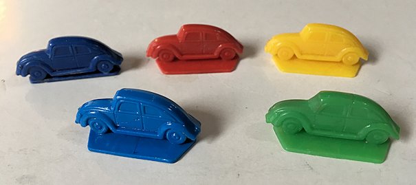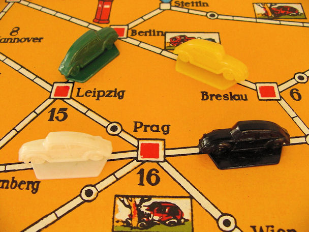One piece solid plastic, thin design of a side view of the Volkswagen Sedan. Molded plastic base plate to hold the VW upright. It was a game piece for 2 game sets - Auf Autostrassen durch Europa and Quer durch 15 Länder. Both games made during the KdF era and post war period. The plastic VW game piese was also used in the JOSEF SCHNEIDER JR-WIEN (J.S.J/W) game set as well.