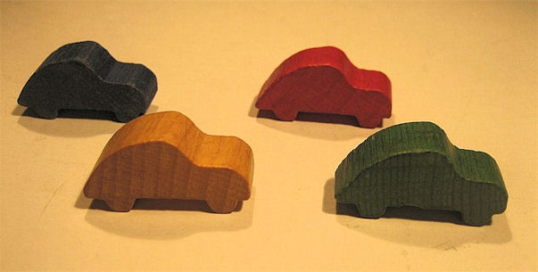 Solid piece of wood cut out into the shape of a Volkswagen Sedan. Painted various colors and was used as a game piece for a game set Auf der Autostrassen durch Europa. Box art work produced in three versions.