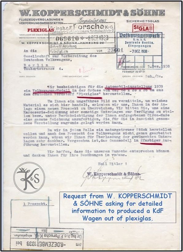 Another picture shows a Gehzuvor Letter: This is a letter dated December 5, 1938, to the "Gesellschaft zur Vorbereitung des Deutschen Volkswagens" (=GEHZUVOR: association for the preparations for the German Volkswagen). In this letter, W. KOPPERSCHMIDT & SÖHNE requests detailed drawings of the KdF Wagen in order to be able to make an accurate scale model of the KdF Wagen in Plexiglas. They also say the dimensions of the KdF Wagen in the brochures are not accurate enough and therefore they need detailed pictures. The idea was to use two colors of Plexiglas for the KdF Wagen model.