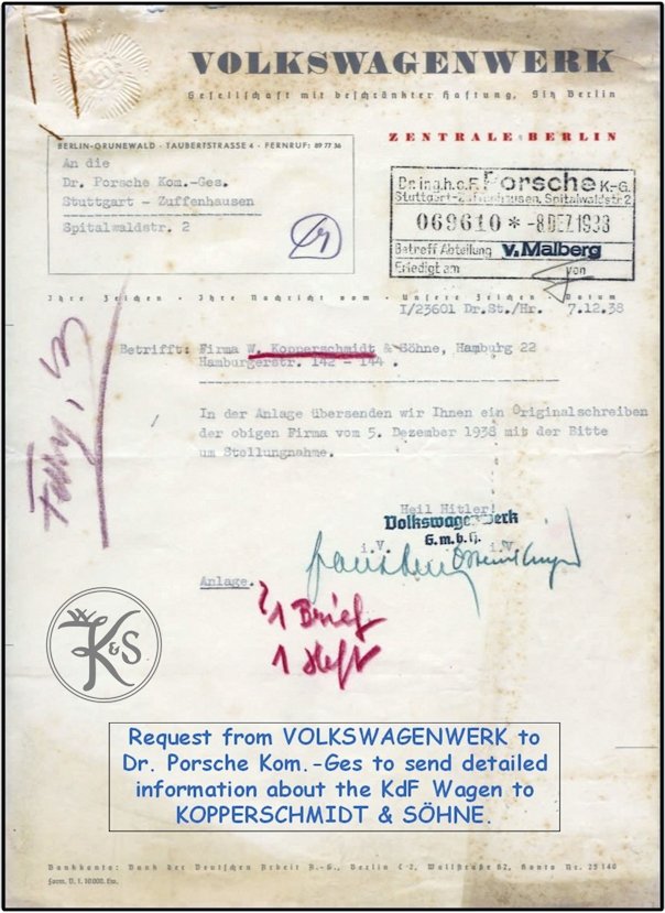 A second letter shows a letter from VOLKSWAGENWERK to PORSCHE: one can read that the GEHZUVOR association sends the information of the firm W. KOPPERSCHMIDT & SÖHNE with its request to the Porsche Company on December 7, 1938. The idea is that Porsche sends detailed drawings to W. KOPPERSCHMIDT & SÖHNE.