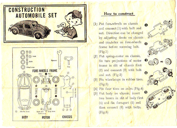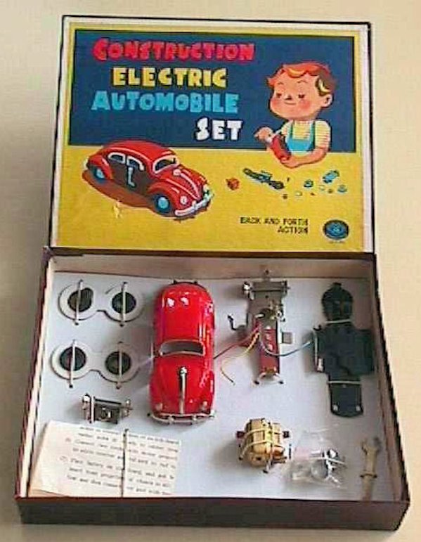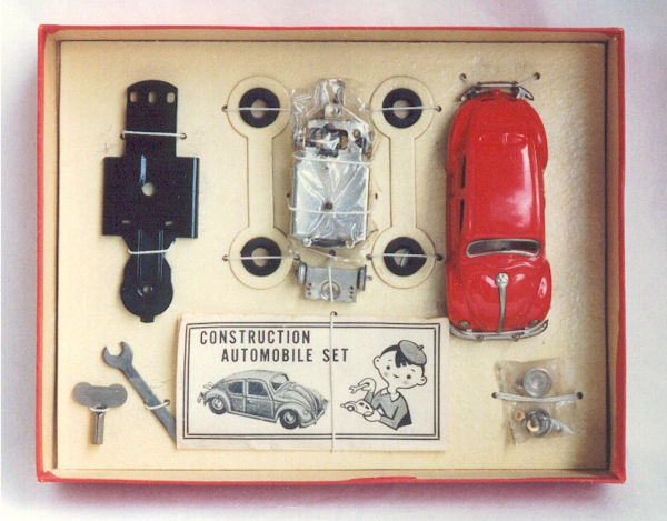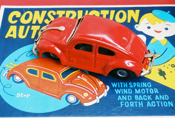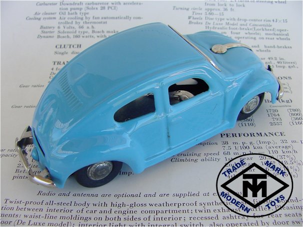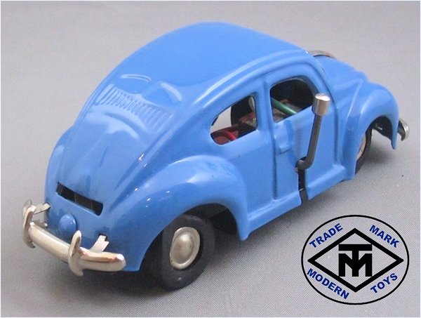 The stamped metal chassis was equipped with either a key wound clockwork motor, battery with an electric motor or just a plain friction motor (rarest version found). The electric and clockwork version featured forward and reverse action by using the metal lever at the side or rear section of the metal VW body. Metal rims with rubber tires were standard and “MADE IN JAPAN” was stamped into the chassis.