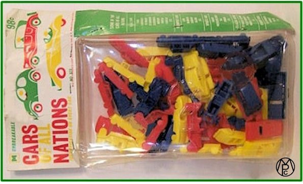 They were made by the Multiple Products Company (MPC) in New York City approximately in 1954. They were frequently sold in bags of 40 or 100, for either 49 or 99 cents, and were originally called "Cars of All Nations" or “Cars of the World”. Usually sold in 5 & 10 stores such as Woolworth’s. They also appeared in the toy aisles of many drug stores and grocery stores. Sometimes known as JALOPIES-Hong Kong but the connection is unknown. Just to note: the MPC Company that produced them has no relation to the MPC Company that later produced plastic model kits.
