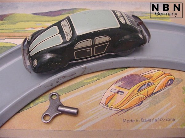 Metal chassis includes bumpers, a clockwork motor and steel button wheels. “MADE IN US ZONE GERMANY” printed under the rear hood and these VWs were part of a track set. A picture of this VW (229/1) is shown in an NBN toy sales catalog. The red version also came with large rubber wheels as well as with a slightly different lithography with the cream white body parts are a very light red instead. Very rarely seen is a non two-tone solid green color with lithographed faces on the windows.