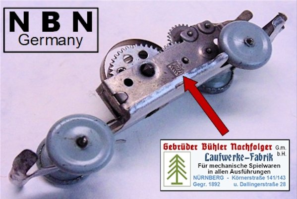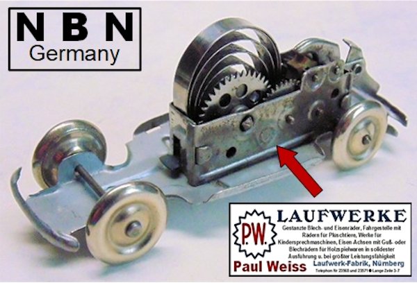 It appears that the clockwerk motors were supplied by 2 different companies. There is a "fir tree" symbol stamped into the side of the clockwerk motor and the original key has the same stamping that indicates the well-known German clockwerk specialist company, Gebrüder Bühler. The Paul Weiss company logo was a multi-pointed star with “P.W.” in the star center.