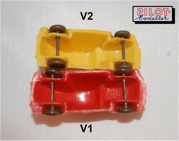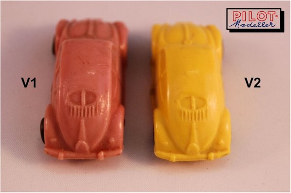 The VW Split Window features a plastic body with solid windows and details of the front and rear hood, doors, headlights and taillights. No chassis and metal wheels with axles attached to the body. License plate may or may not be painted black. No markings. The PILOT V2 is a slightly smaller version of the PILOT V1 (V1 marked with PILOT inside the roof).