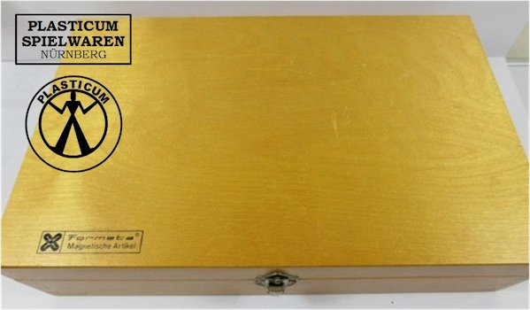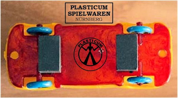 FORMETA MAGNETISCHE ARTIKEL produced a German driving school instruction set. The set came in a wooden box that had a paper driving template, road signs and several vehicles. One of the versions of this box come with a yellow, red, blue or green PLASTICUM Split Window Volkswagen without motor but with baseplate. The plastic chassis had two small magnets glued to it allow the VW to remain stationary on the driving template.