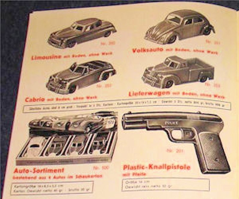 From its early start, the company focused on cheaper mass market articles. They produced plastic products like dolls, cars, figurines, toy guns, toy music instruments, etc. They cooperated with companies in other markets, like Starlux and Minialuxe in France.
