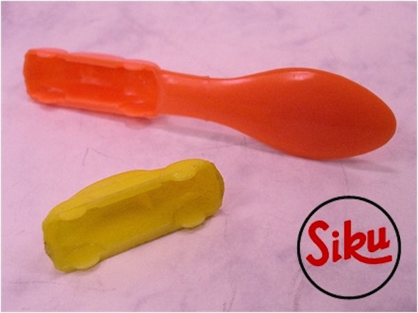 Plastic body with solid windows and details of the front and rear hood, doors, headlights and a raised license plate light. No chassis and the plastic wheels are part of the body. Also a very rare red version with separate plastic wheels and axles is known. There is a number 4 under the front hood and a round mold mark under the back part of the roof. Promotional items used in the 1950s by Fri-Homa in Germany, Jamin in Holland and various other companies. Supposedly, DS plastics in The Netherlands acquired the molds and/or a license for production in The Netherlands. Also used as an ice cream spoon. The ice cream spoon was used by ice cream manufacturers in the 1950's in Europe. See the yellow spoon with the C.Jamin marking, which was used for the candy and ice cream manufacturer Jamin from The Netherlands. The orange spoon dates from the 1970's from Colombia; most probably the molds were sold to and re-used in South America! The kids would eat their ice cream and break the spoon off the car afterwards, so the car would remain. It explains why a complete spoon is very rare to find! It came in 5 or 6 different car makes, among which the Split Window VW Beetle.