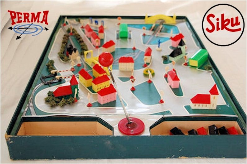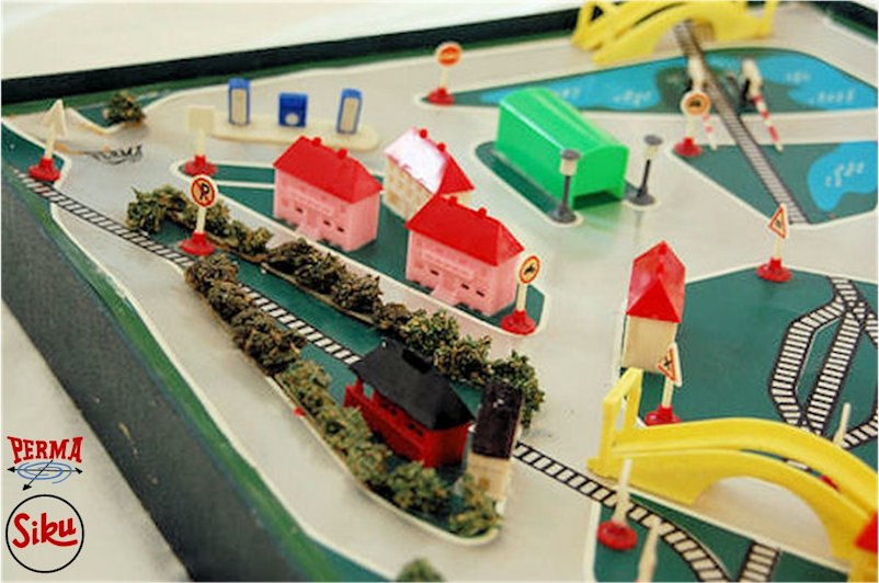 SIKU produced this model for the toy brand Verlag PERMA GmbH Nürnberg, Germany. Plastic body with solid windows and details of the front and rear hood, doors, headlights and a raised license plate light. No chassis and plastic wheels are part of the body. There is a number 4 under the front hood and a round mold mark under the back part of the roof as well as the front hood. Similar to SIKU FRIHOMA JAMIN Split VW. A metal clip attached to the rear wheels, used to steer the car around by magnetic force on the PERMA game board. The PERMA game board set came with several other cars and plastic houses.