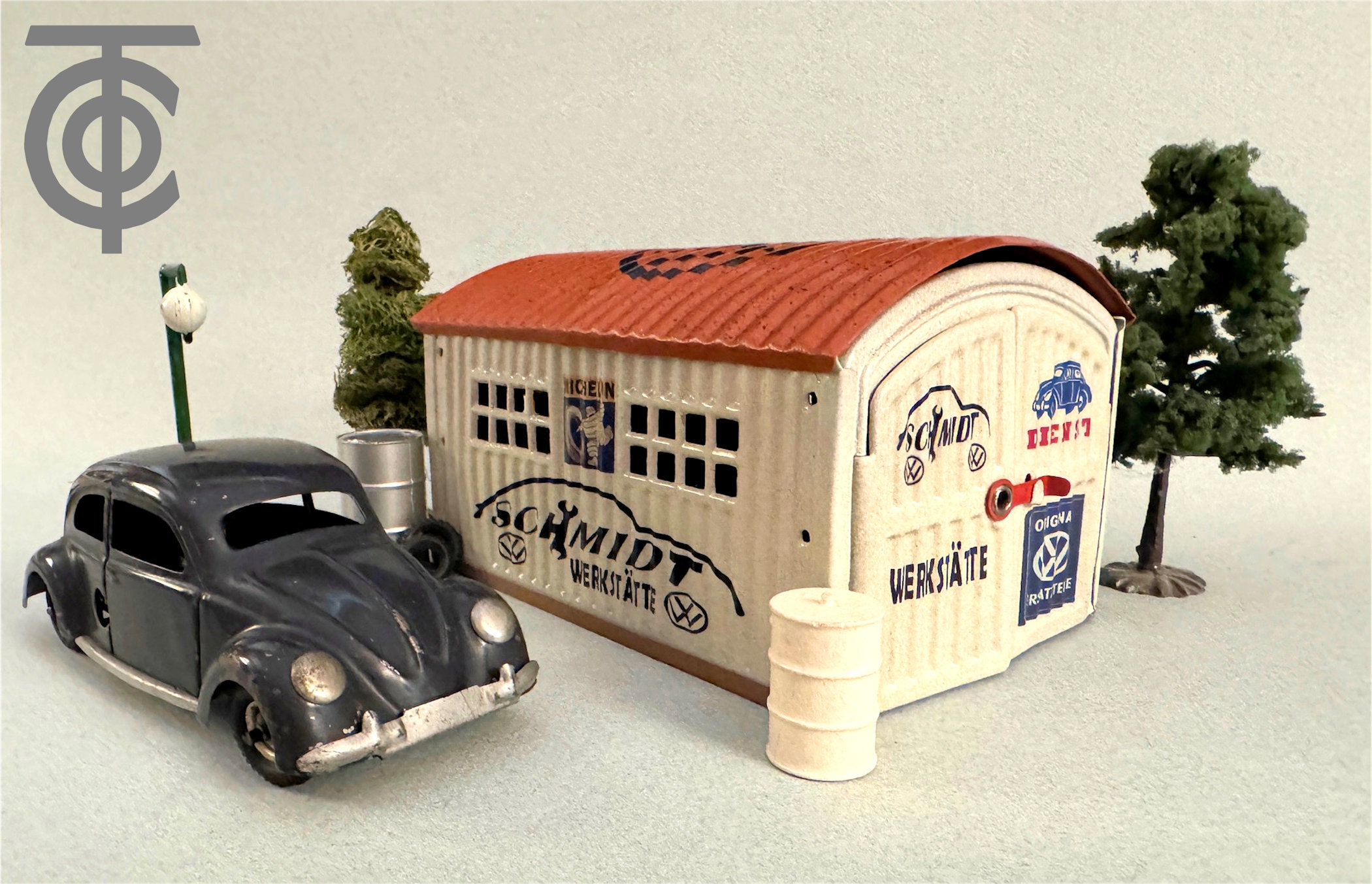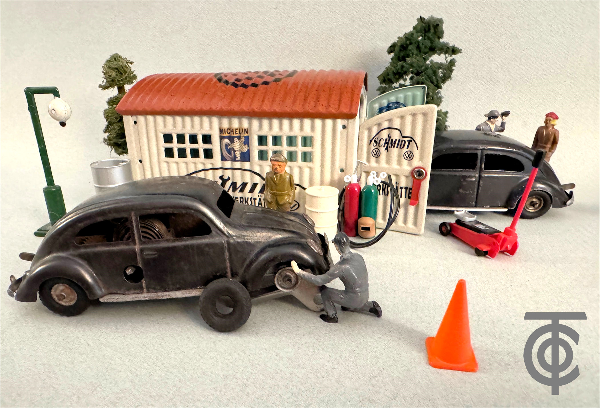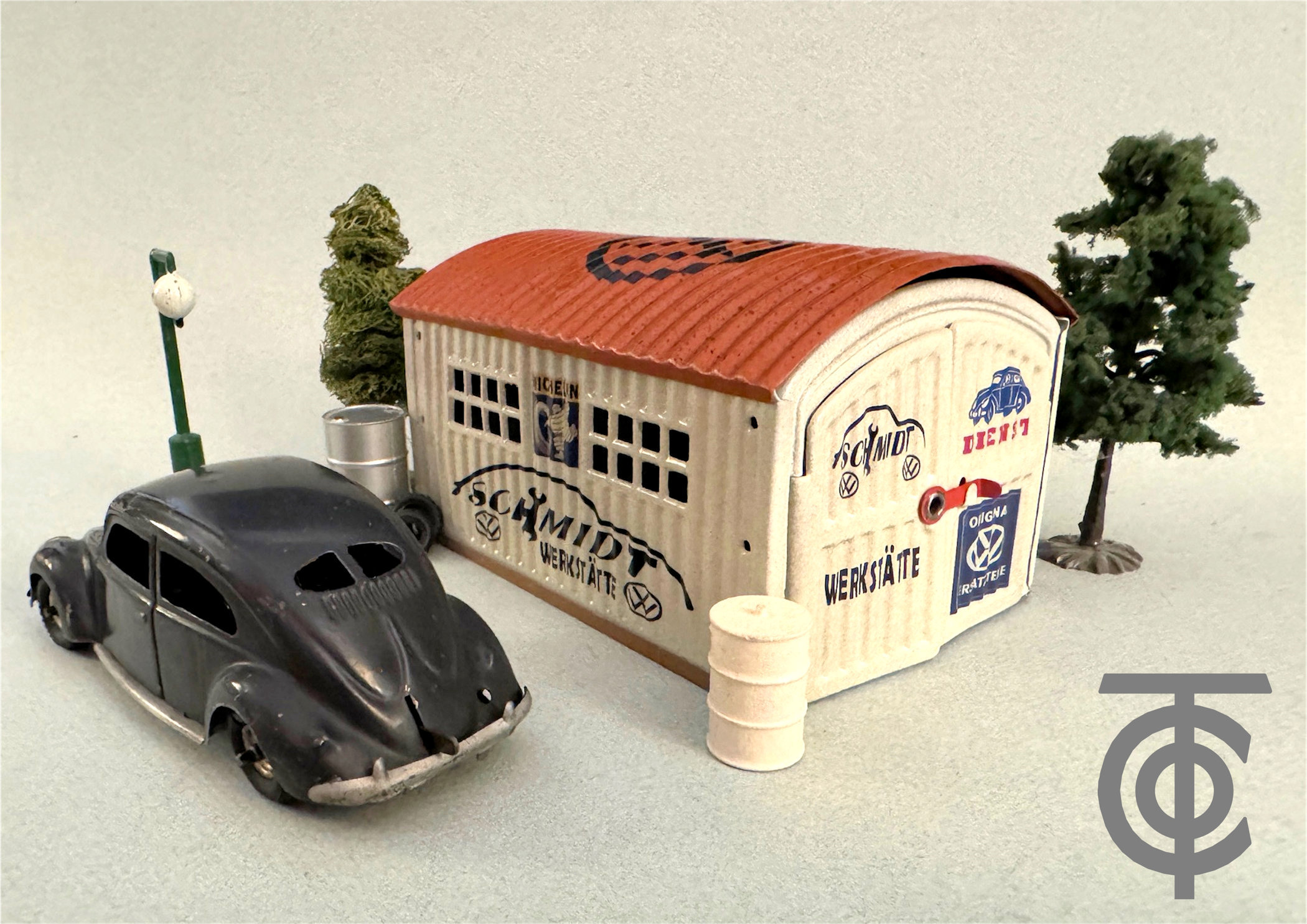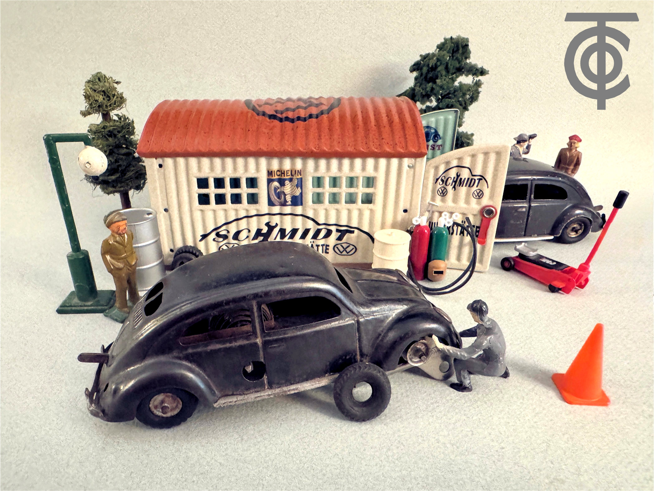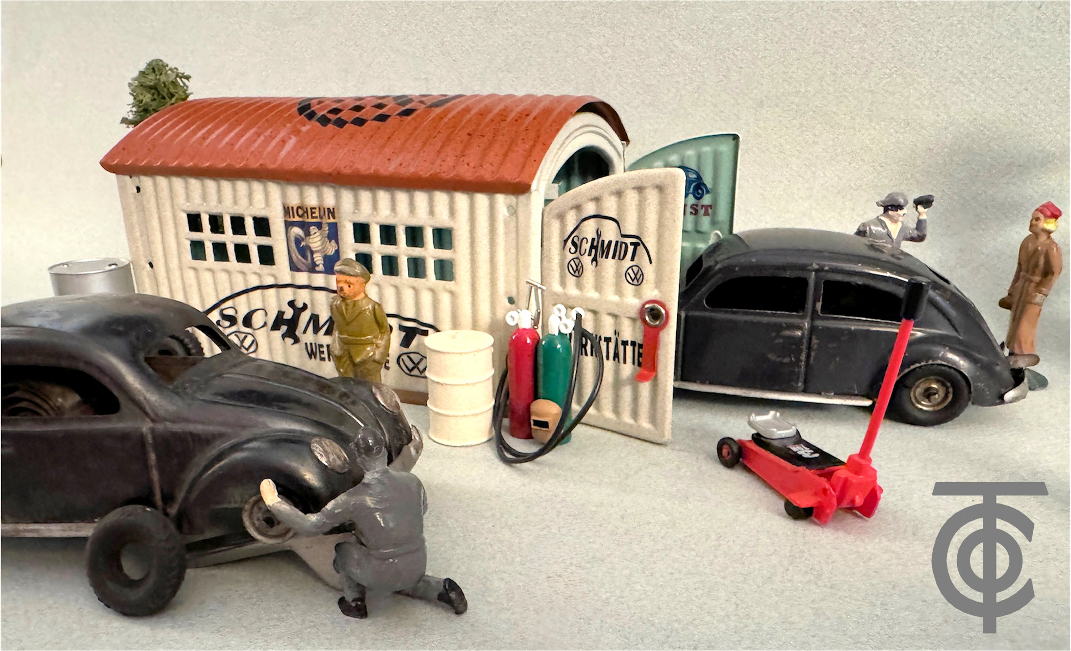 Just To Note: There are several interesting diorama type photos using the KdF Wagen TIPPCO Split VWs and some GELY tin garages that have been restored for the era. These special diorama photos were created by Rick Search, the site facilitator for the Vintage VW Cabrios Toys.
