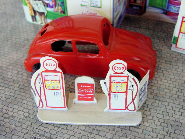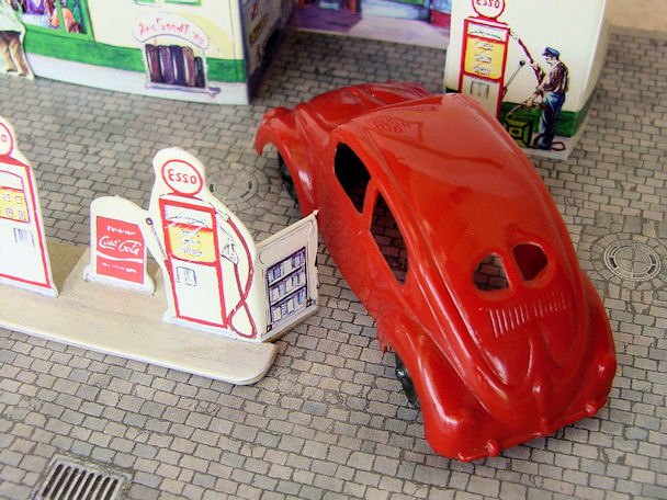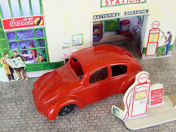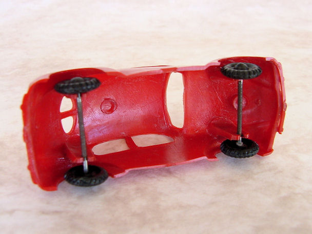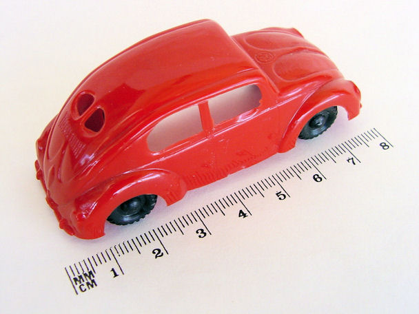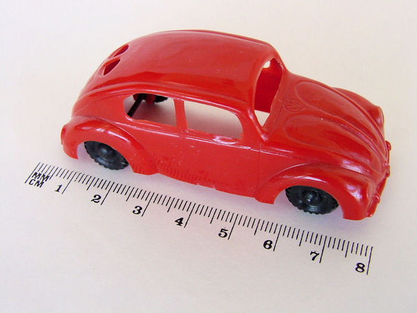 Plastic body with cut out windows and molded bumpers. VW hood emblem and 14 air louvers under the split window. No chassis and the inside body has two round plastic mold marks on the front hood and roof. Plastic wheels are snapped onto the body with metal axles. Often called a PLASTICUM or VOSS VW, which they are most probably NOT.