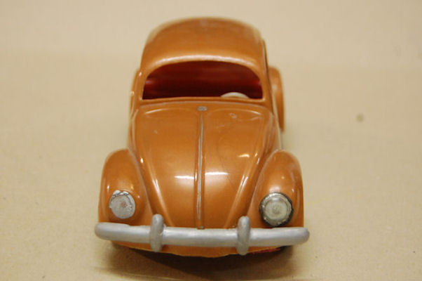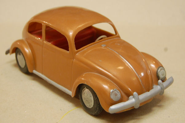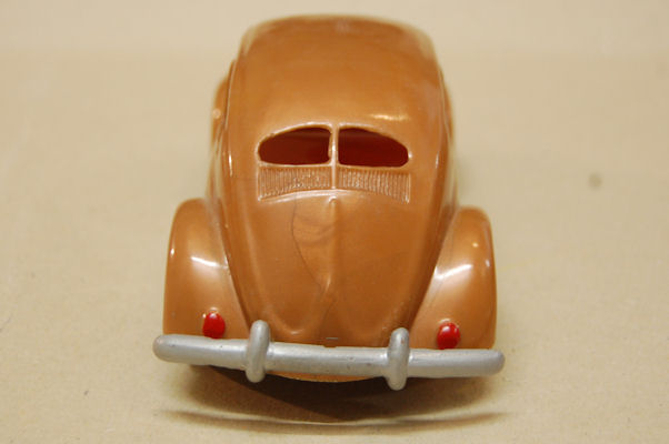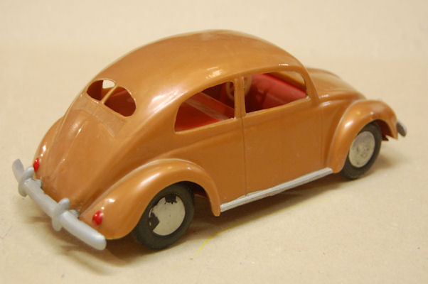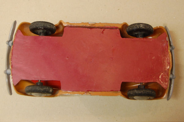 A hard plastic body with a metal painted interior and white plastic 3-spoke steering wheel. The plastic silver colored bumpers (solid) were glued to the chassis. There is a large round mold mark inside the roof. The chassis (no motor) is a plain plastic sheet. It has hard plastic wheels and rubber tires. The headlights are glued onto the chassis; the rear lights are painted red. Some examples were marked on the inside of the body (next to the mouldmark on the roof) and on the inside of the chassis with the numbers 2 7 5.