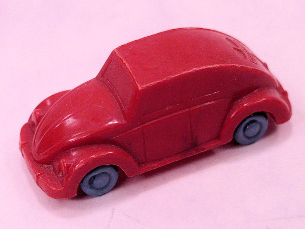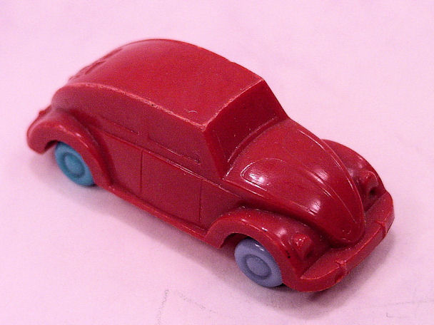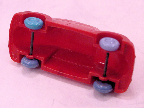 Plastic body with solid windows and details of the front and rear hood, doors and headlights. No chassis and the blue, red or yellow plastic wheels are with wire axles attached to the body. There is a round mold mark under the front hood and under the back part of the roof.