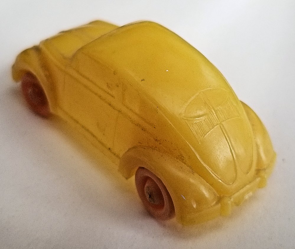 Plastic body with solid windows and details of the front and rear hood, doors and headlights. No chassis and pink plastic wheels and wire axles attached to the body. There is a round mold mark and reversed number 2 under the front hood and under the back part of the roof.