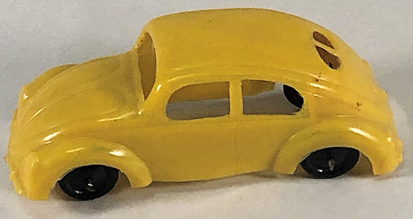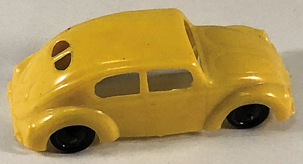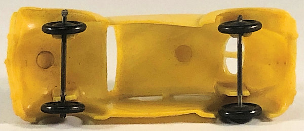 One-piece thin brittle plastic model with cut out windows. Body has door seam lines, front hood handle, headlights, license plate light and round taillights. Front and rear bumpers with guards are molded into the body. No chassis or markings except for two round mold marks inside the roof. The black plastic wheels are mounted on metal axles. They are attached to the body separately on extended body pillars. The rear split window has 14 air louvers.