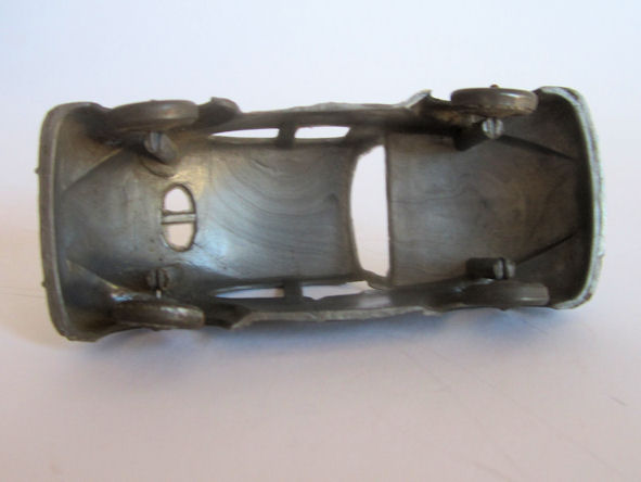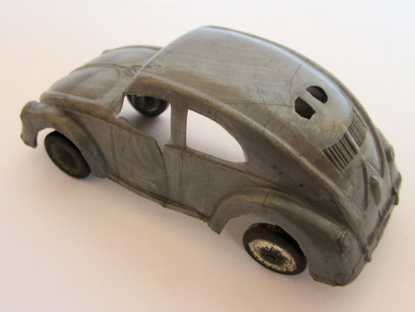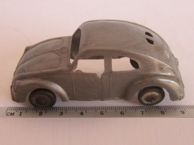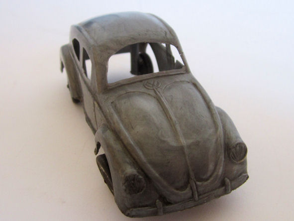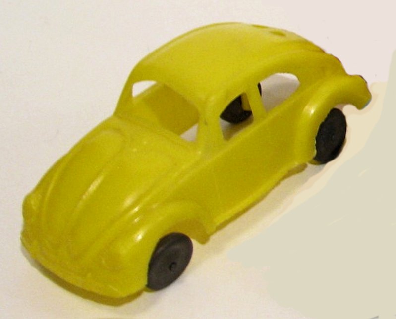 One piece plastic model with cut out windows. Body has door seam lines, VW hood emblem, hood strip, handle, headlights, license plate light and round taillights. Front and rear bumpers with guards are molded into the body, No Chassis or markings. The black and silver painted wheels are attached to the body separately on extended body pillars. The rear split window is small and is a little higher on the body than normal.
