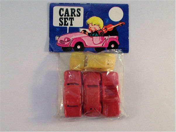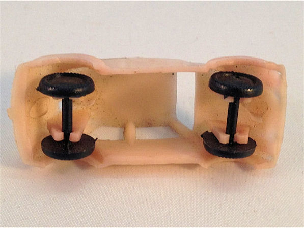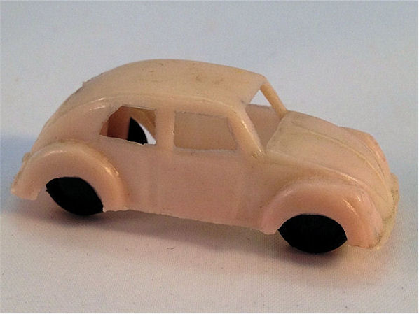 Soft plastic body with open windows with details of the front and rear hood and doors. No chassis with black plastic wheels and axles. Three small mold marks under the roof and under the front and rear hood. No marking. Very cheap production.