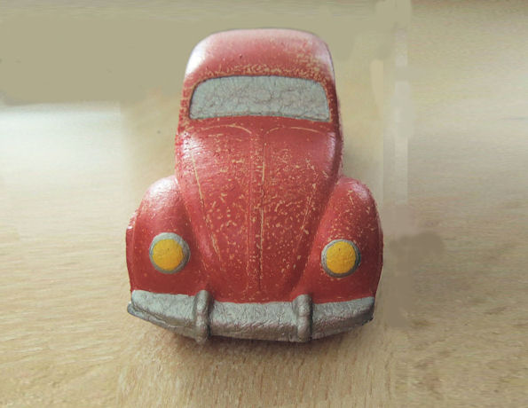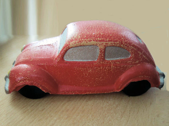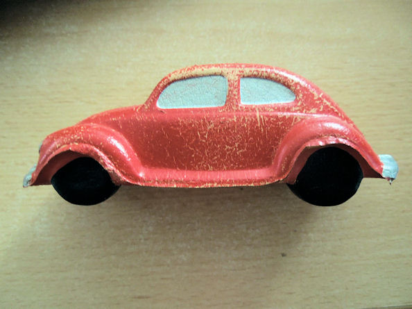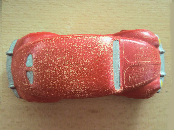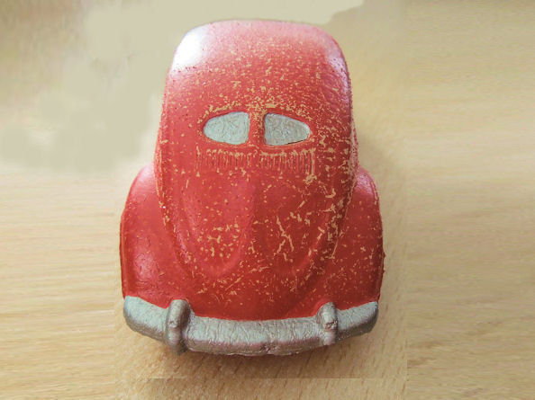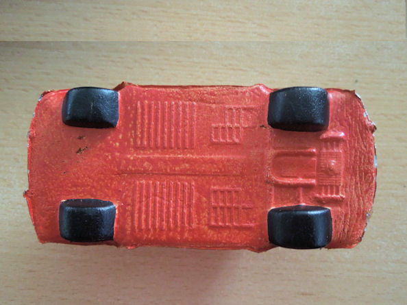 It shows some resemblance to the Finnish Nokia rubber split, but the maker is unknown. The toy is made of foam rubber, the wheels are incorporated into the body. The chasis shows details of the indentations of the original split chassis.