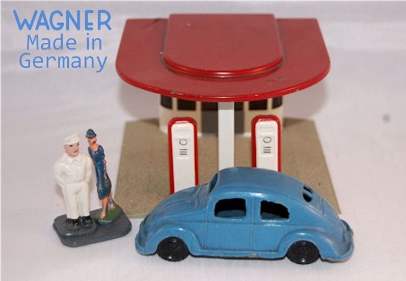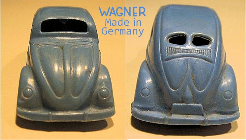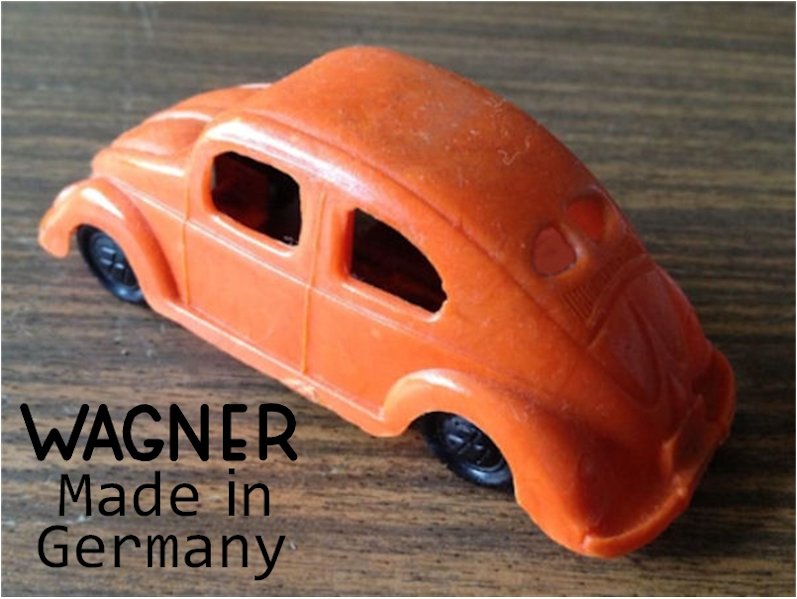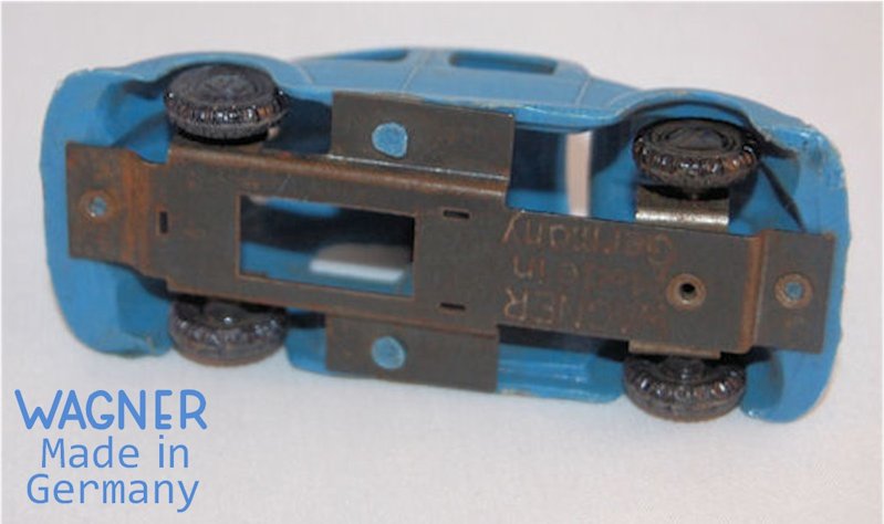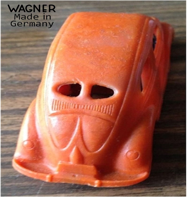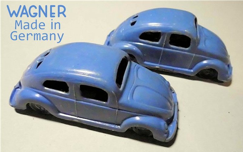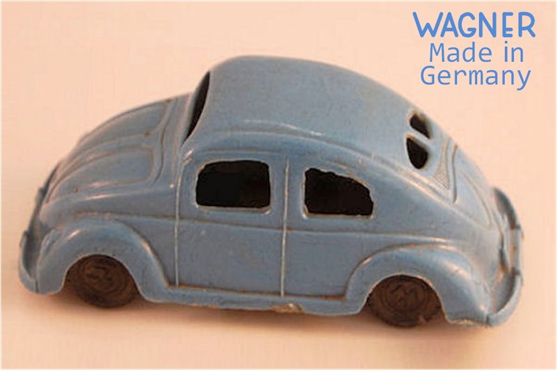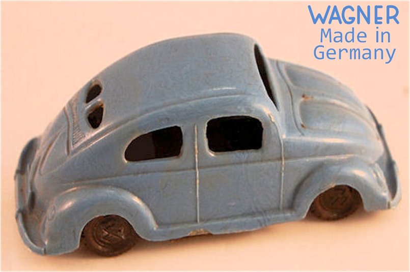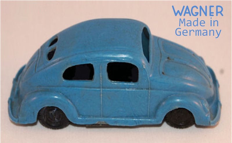 A beautiful and extremely rare example of a very early plastic Split VW. "Made in Germany" suggest prewar or war period and the body details of the car also depict a very early model. On the other side, hardly any plastic toy car was made before or during the war, except for the Eckert & Ziegler.... so, quite a mystery. One-piece body with open windows with very accurate details. On the inside of the roof section there is a large round mould mark. Black plastic wheels with the large VW logo on metal axles. The metal base plate is hold to the plastic body by moulded tabs. The chassis shows the name of WAGNER and Made in Germany. The base plate shows a rectangular and tab opening for a motor however no visible signs that this model ever had a motor.
