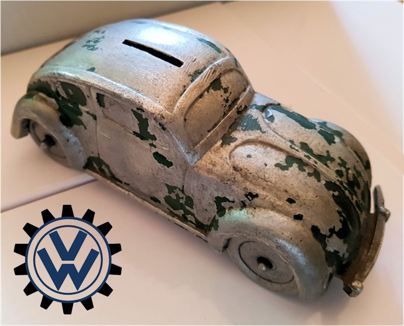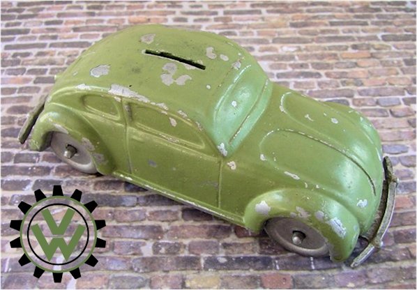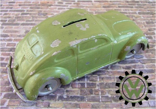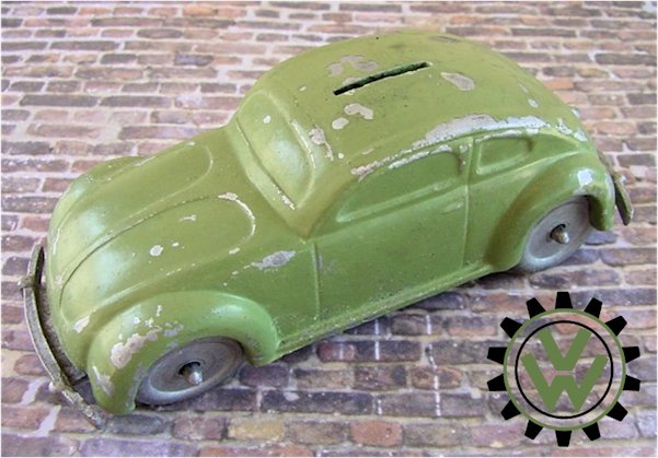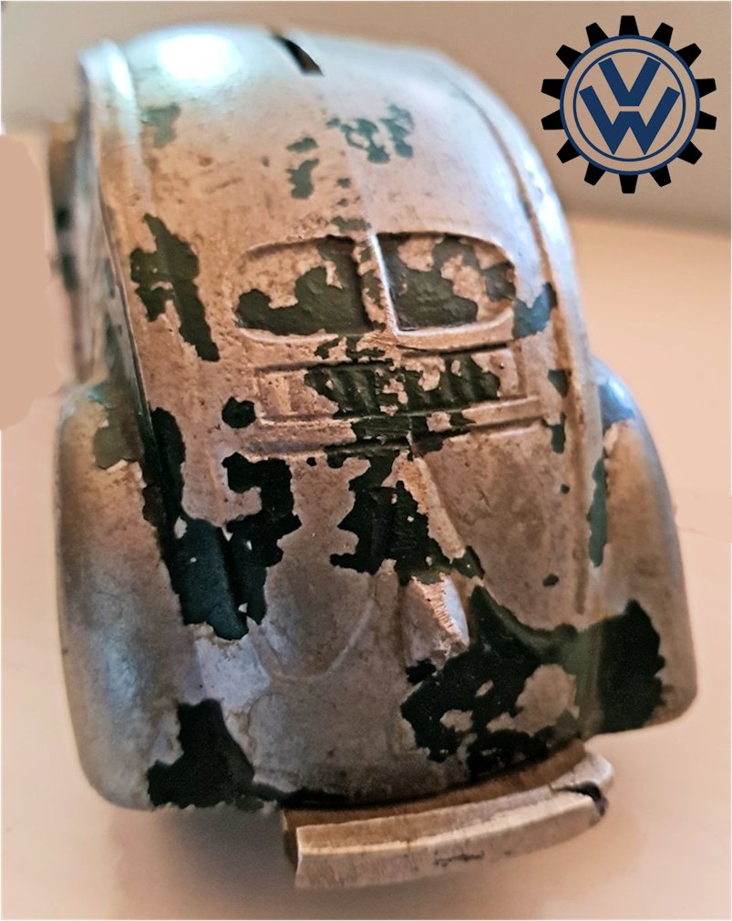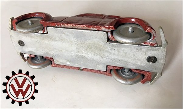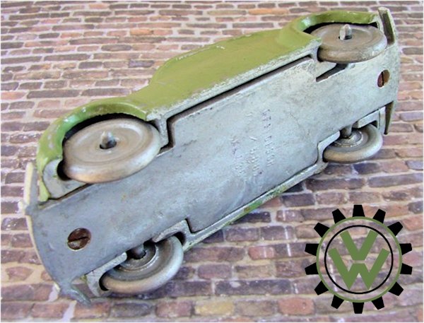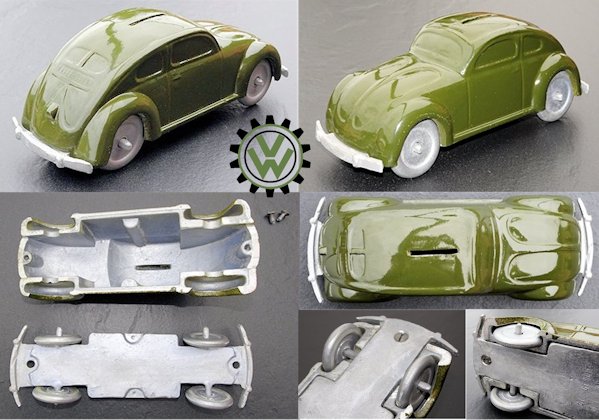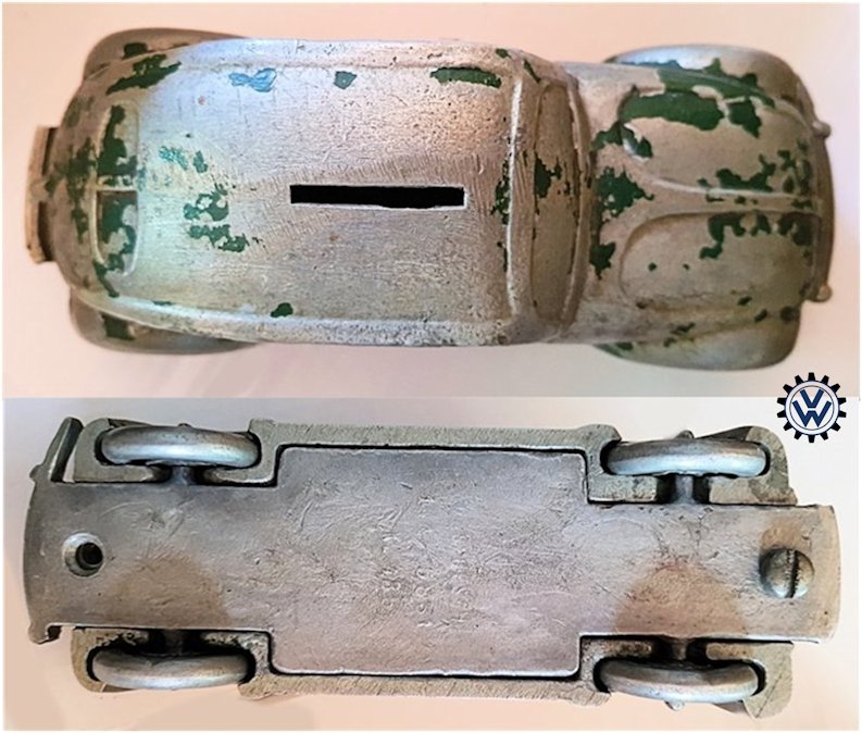 A very nice, desirable, and seldom found one piece cast aluminum hollow body with solid windows and a slit in the roof as it was designed by Hans Weber for a KdF Sparkasse (savings bank). Hans Weber was based in Spenge in Westfalen, Germany in the Adolf Hitlerstrasse 253. A cast aluminum base plate with bumpers and wheels attached to it. Metal wheels/tyres on metal axles. The chassis secures to the body with 2 screws to allow the bank to open to release the coins. The base plate is stamped “Ges Gesch 144/5881 Kl.43b". This entry forms a patent dated 9/6/38 entitled ‘Volkswagen Sparkasse” (VW Savings Bank). Kl.43 b refers to the class of toys ("coin machines") and 144/5881 is the registration number of the patent. The original idea was that this Volkswagen Sparkasse would serve as a savingsbank for people who would have to save money to buy a real KdF Wagen. It was also planned to include a mechanism to calculate how much was saved and a lock with a key to open the coinbox (the patent granted was for a VW KdF coinbox with that mechanism: "Sparkasse mit Zähleinrichtung in Form des KdF-Wagens").