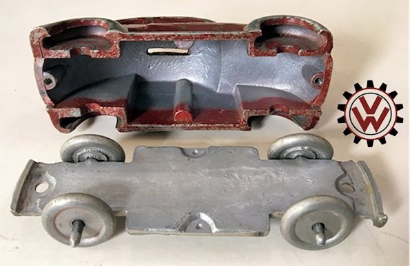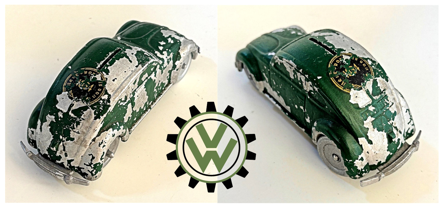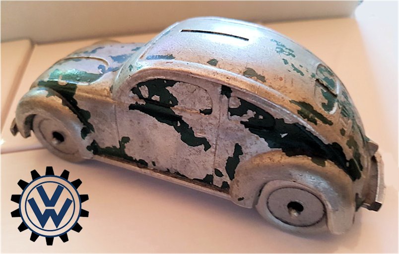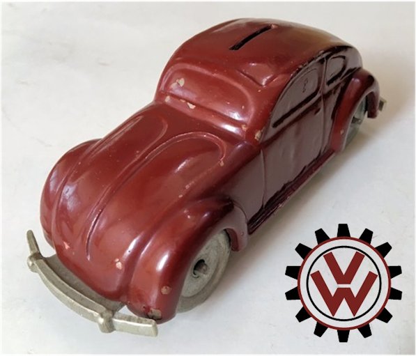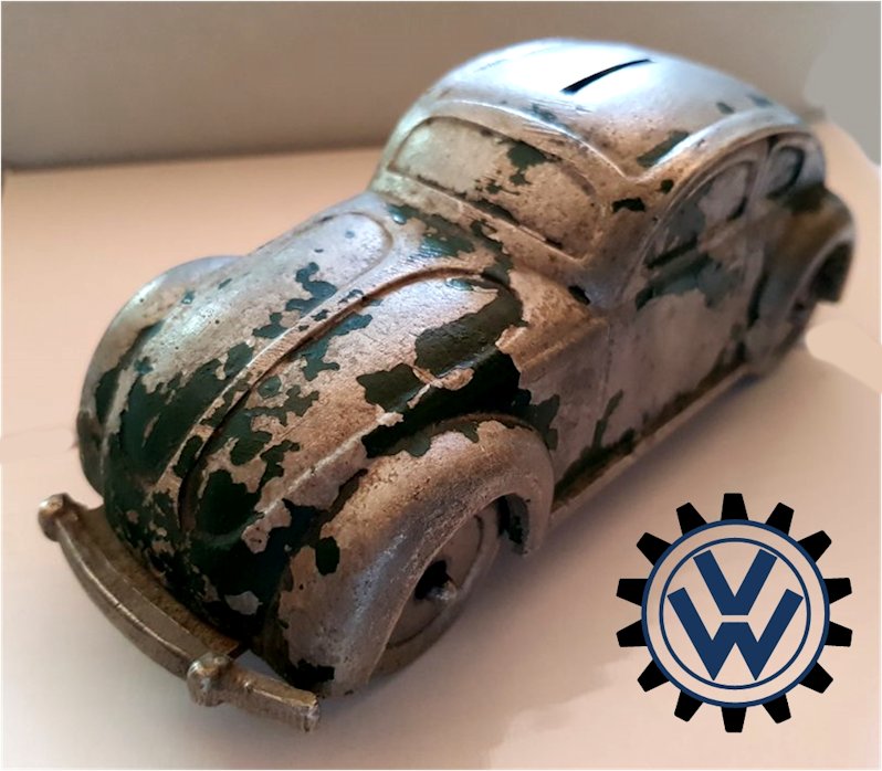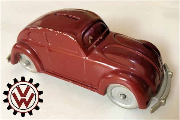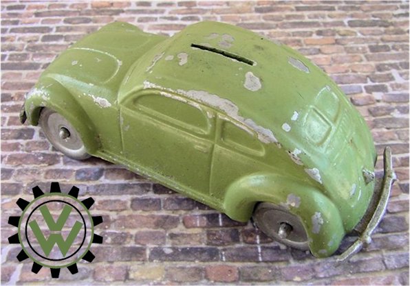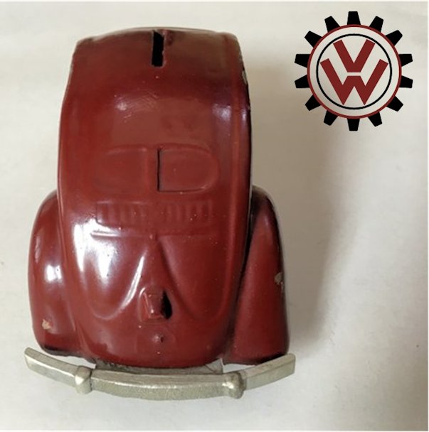 A very nice, desirable, and seldom found one piece cast aluminum hollow body with solid windows and a slit in the roof as it was designed by Hans Weber for a KdF Sparkasse (savings bank). Hans Weber was based in Spenge in Westfalen, Germany in the Adolf Hitlerstrasse 253. A cast aluminum base plate with bumpers and wheels attached to it. Metal wheels/tyres on metal axles. The chassis secures to the body with 2 screws to allow the bank to open to release the coins. The base plate is stamped “Ges Gesch 144/5881 Kl.43b". This entry forms a patent dated 9/6/38 entitled ‘Volkswagen Sparkasse” (VW Savings Bank). Kl.43 b refers to the class of toys ("coin machines") and 144/5881 is the registration number of the patent. The original idea was that this Volkswagen Sparkasse would serve as a savingsbank for people who would have to save money to buy a real KdF Wagen. It was also planned to include a mechanism to calculate how much was saved and a lock with a key to open the coinbox (the patent granted was for a VW KdF coinbox with that mechanism: "Sparkasse mit Zähleinrichtung in Form des KdF-Wagens").