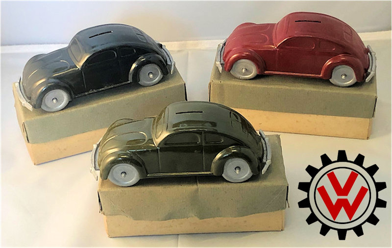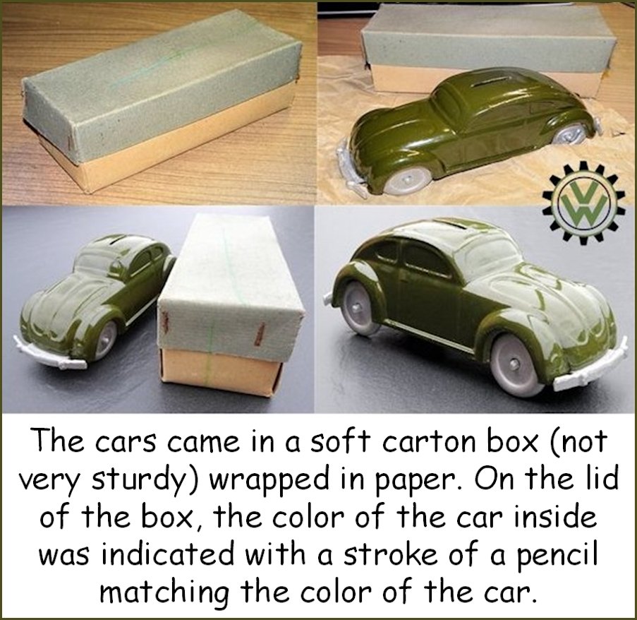 It appears the design with the calculating mechanism did not prove practical and the project was abandoned? No Weber volkswagen coinboxes are known to exist with this mechanism or with a lock. One example was featured with thin steel wheels. A limited amount of Webers are known to exist, one without bumpers which may have been the first prototype. The cars came in a soft carton box (not very sturdy) wrapped in paper. On the lid of the box, the color of the car inside was indicated with a stroke of a pencil matching the color of the car. The box measures 16,5 cm x 7 cm x 6 cm. Before being painted with the final color, most of the cars received a red primer.