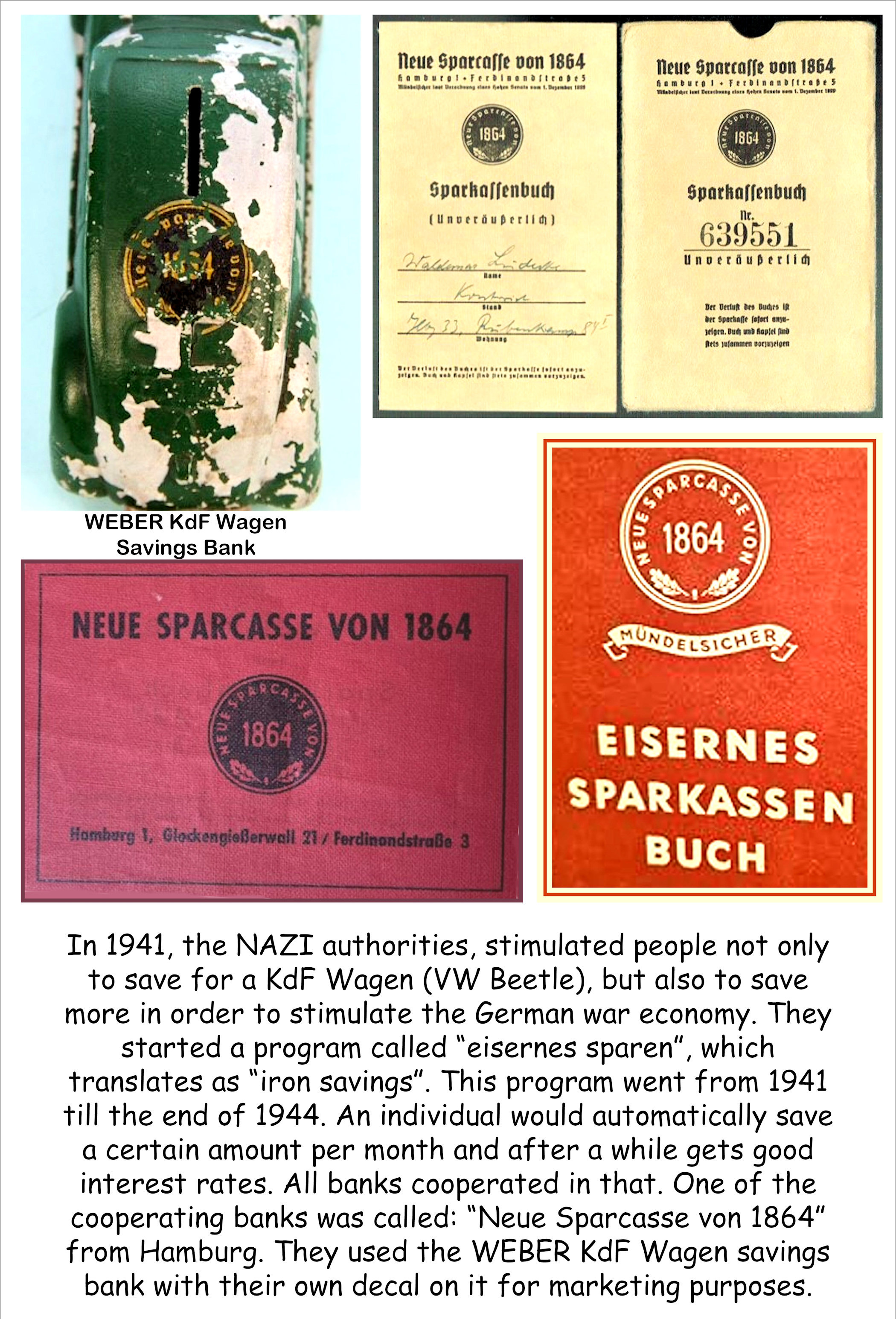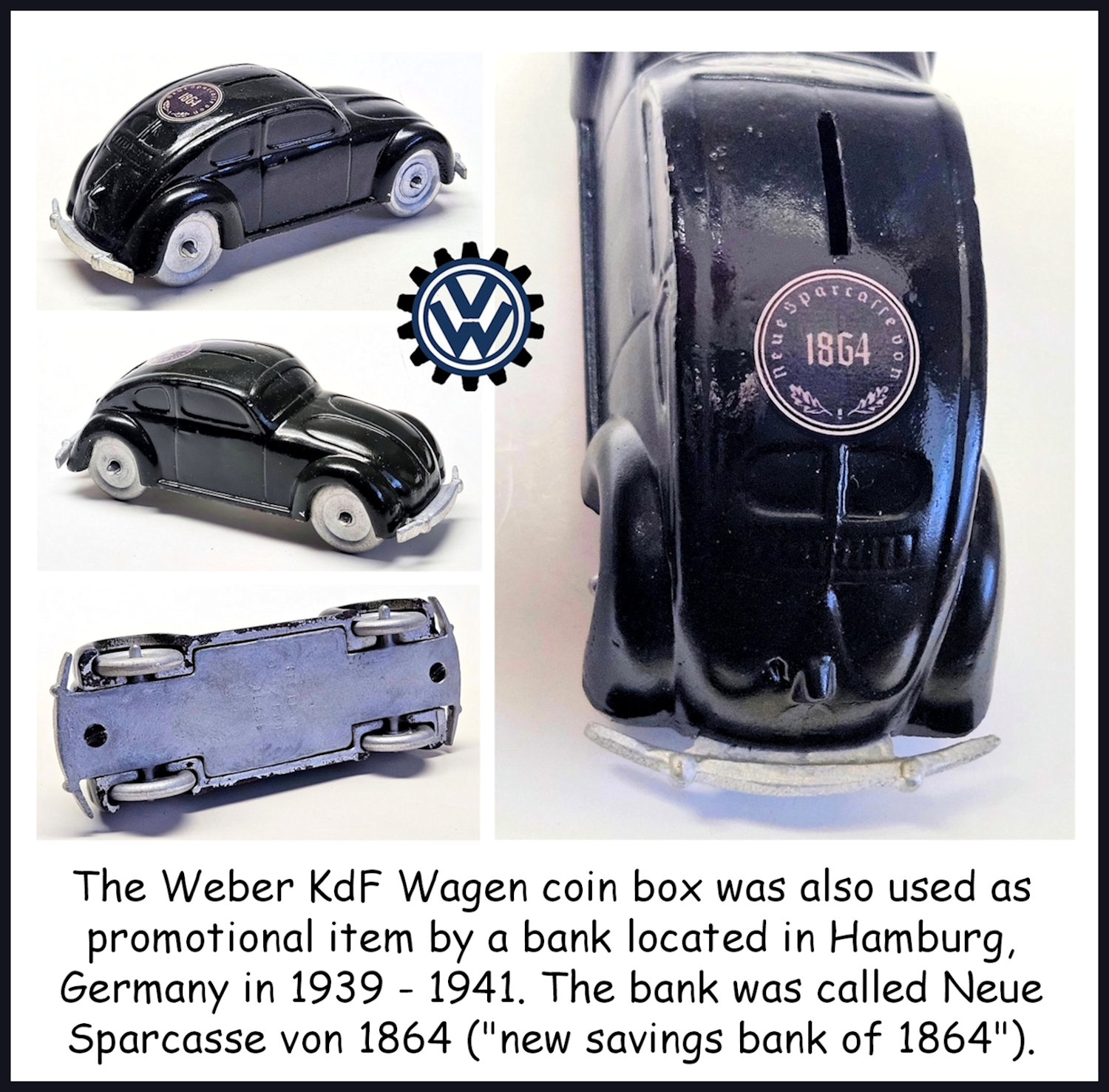 The Weber coinbox was also used as promotional item by a bank located in Hamburg, Germany in 1939 - 1941. The bank was called Neue Sparcasse von 1864 ("new savingsbank of 1864"). The inserted a sticker with their logo above the rear splitwindow (see the pictures).