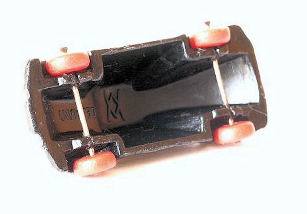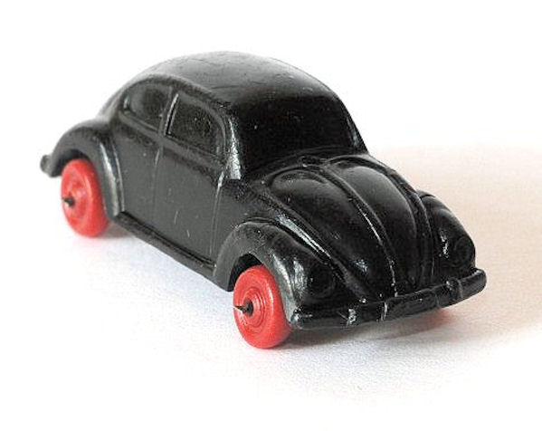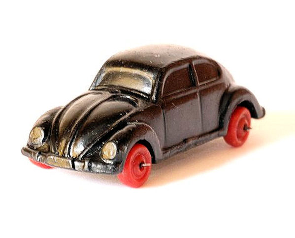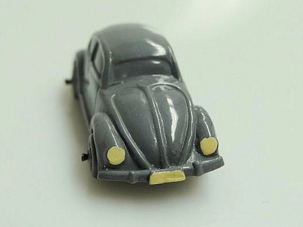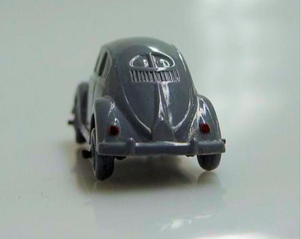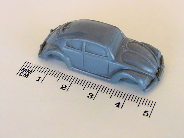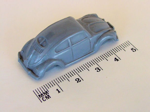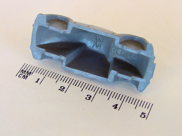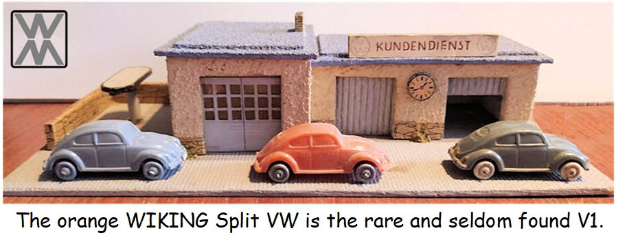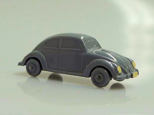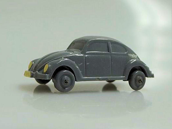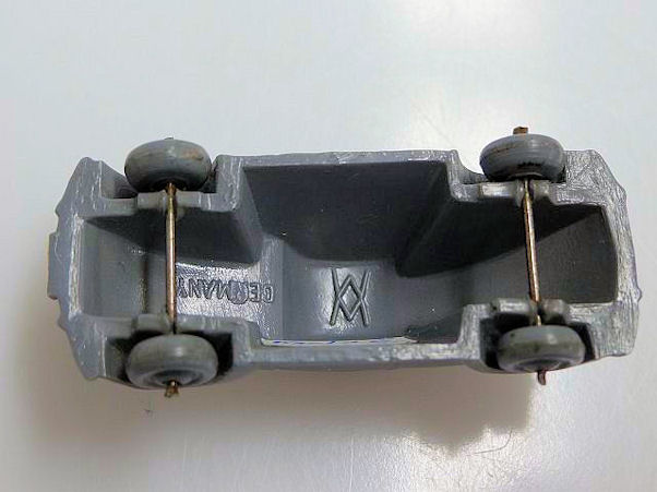 Very detailed plastic body, for its size, with solid windows. No chassis and the bumpers are part of the plastic body. Found with or without plastic wheels on metal axles melted into the body mold extensions. Initially produced for train dioramas. Inside area marked “WM"(on inside roof) and "GERMANY” (inside front hood). Important characteristic: it has no rear or front hood handle, nor has it a rear license plate light. This series V1 has thicker/ wider wheels than the versions V2 and V3. The wheels came in various colors: grey, red, ultra marine blue and silver.