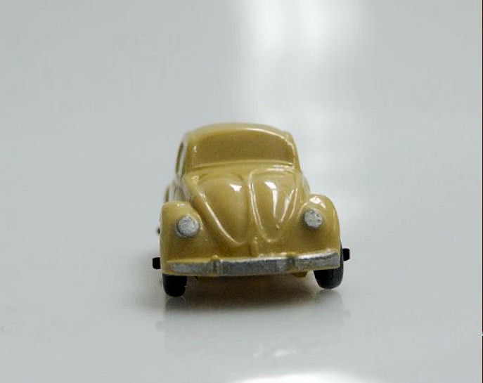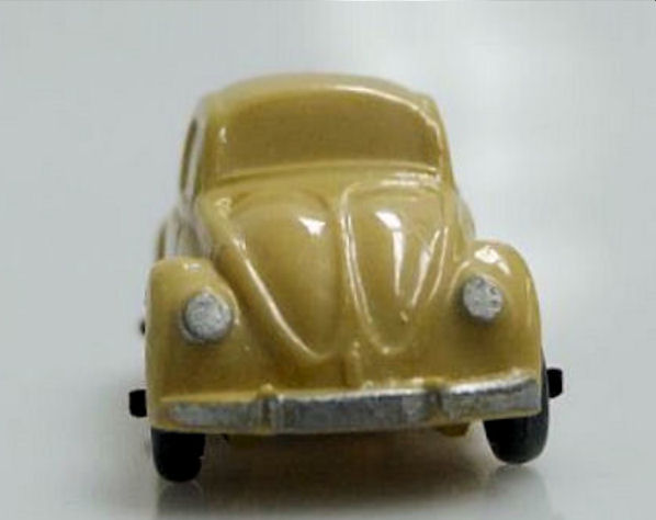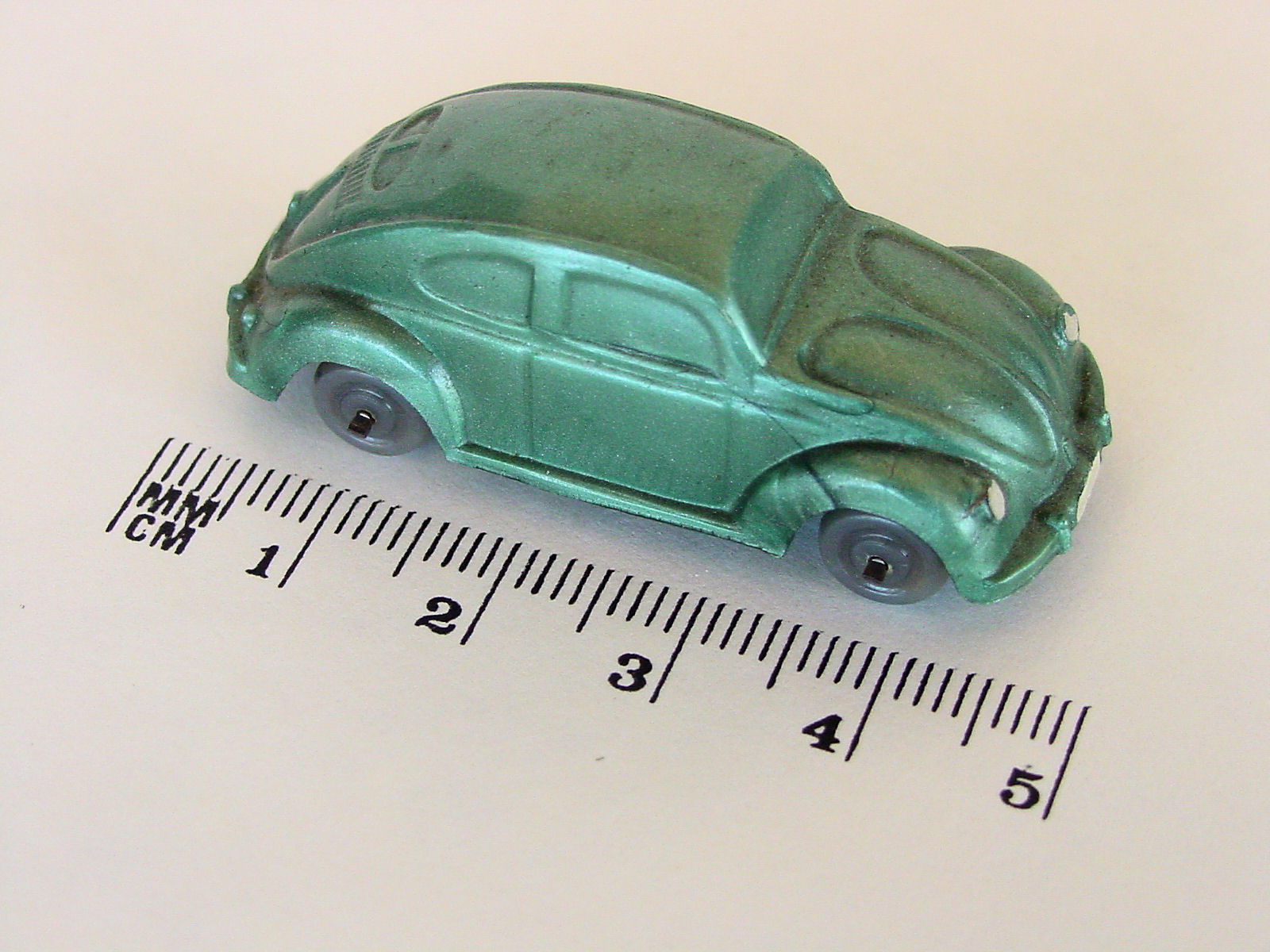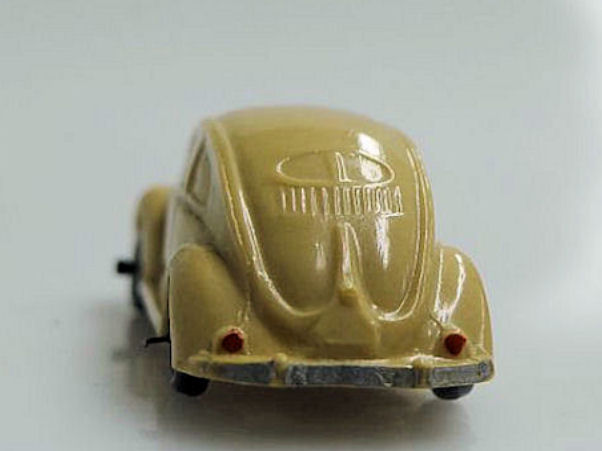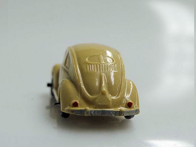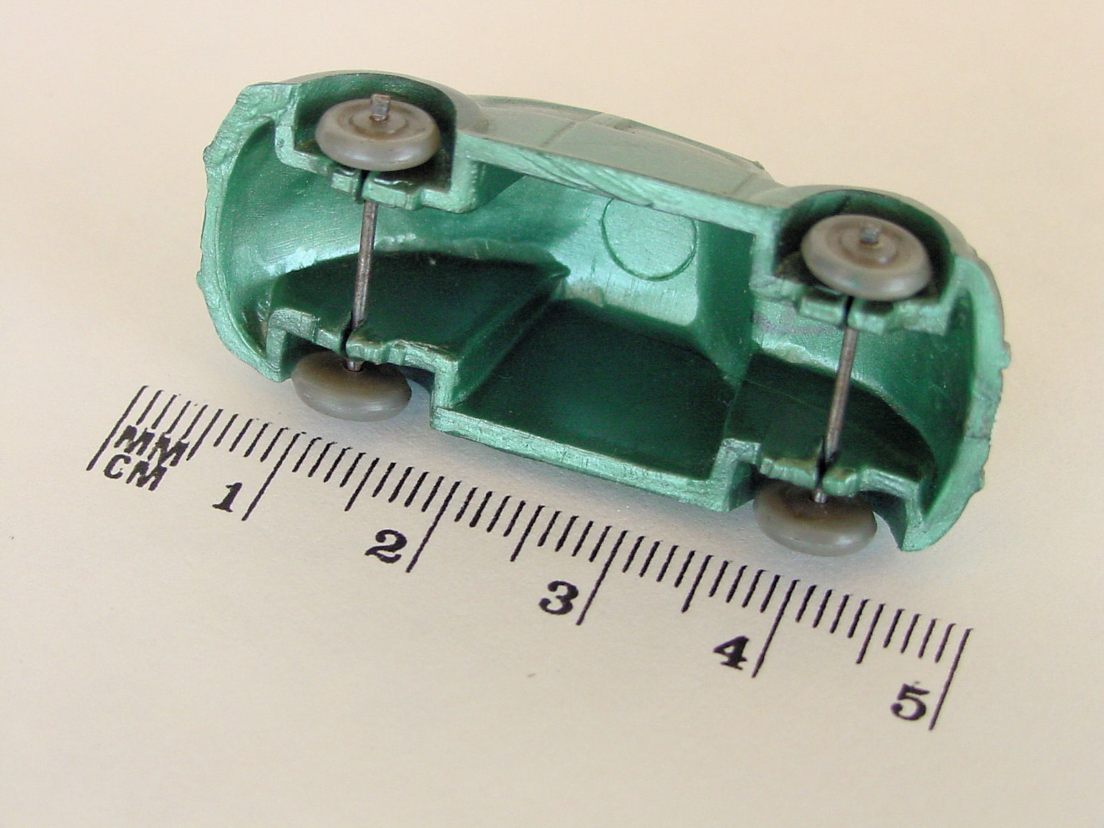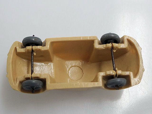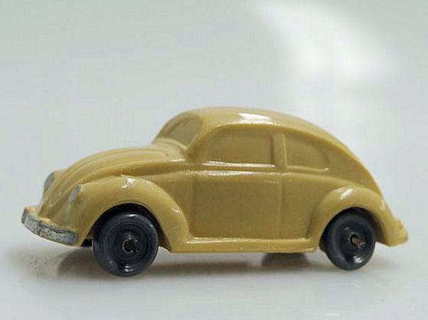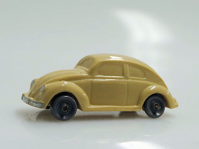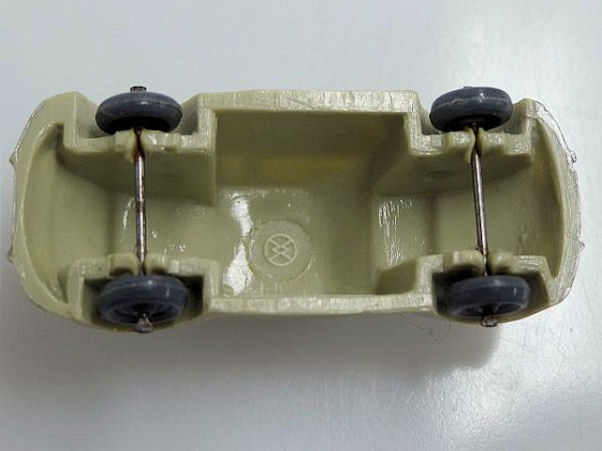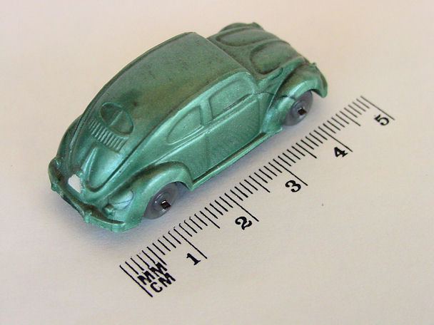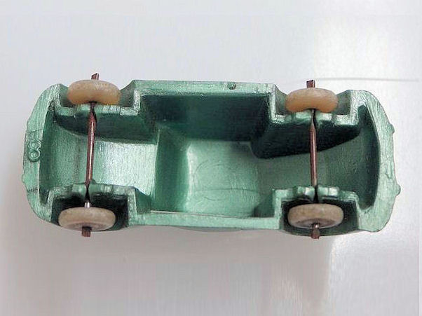 Second release with a fairly detailed plastic body, for its size, with solid windows. No chassis and the bumpers are part of the plastic body. Plastic wheels on metal axles melted into the body mold extensions. It however has a front hood handle and a rear license plate light. The wheels were more narrow/ less wide than the series V1. The color used on the wheels was always grey.