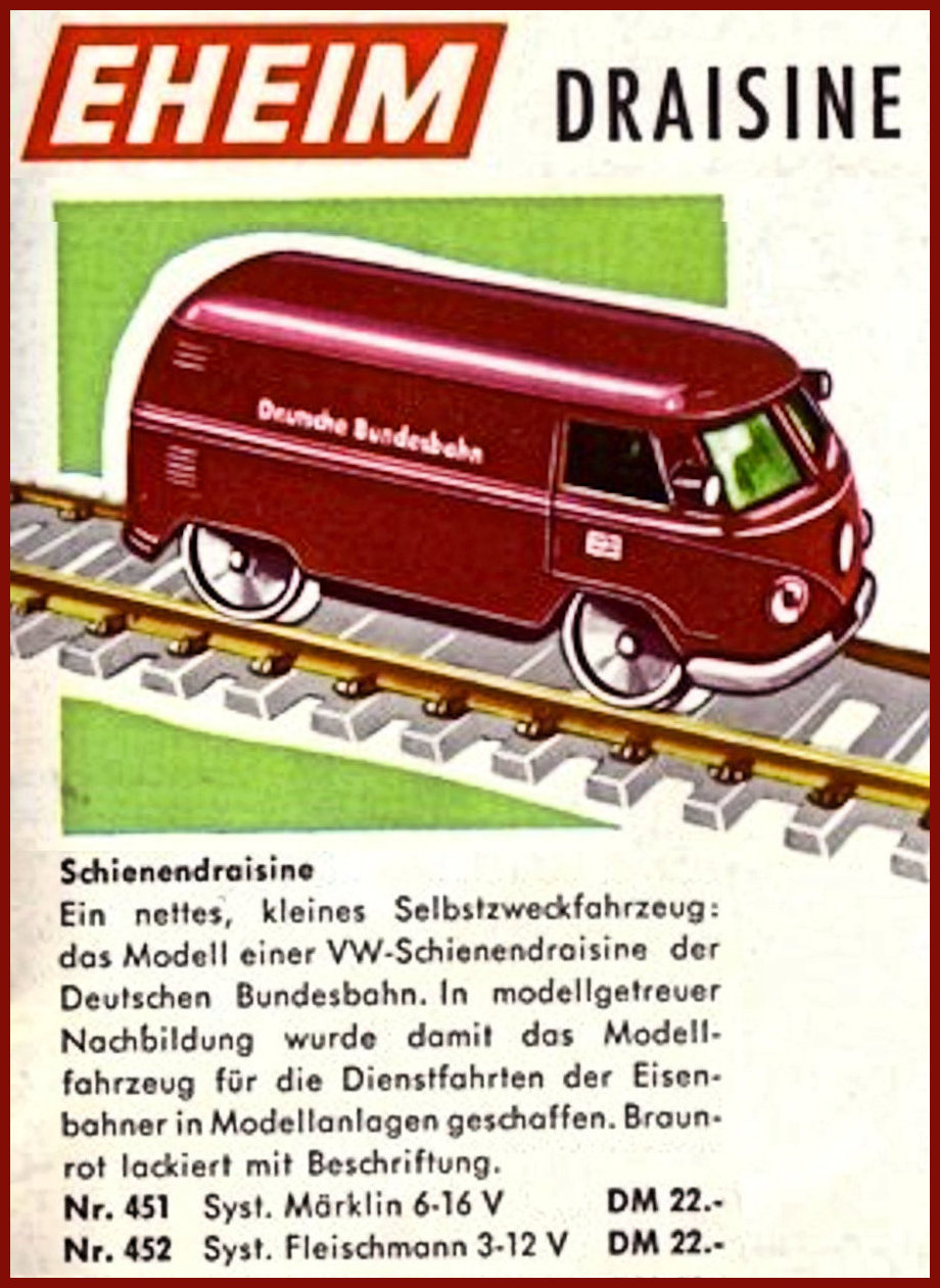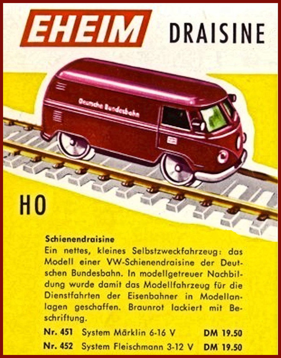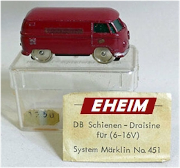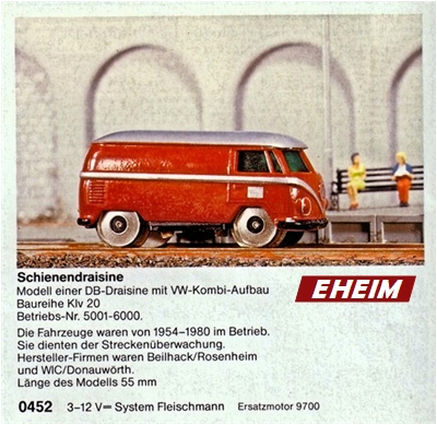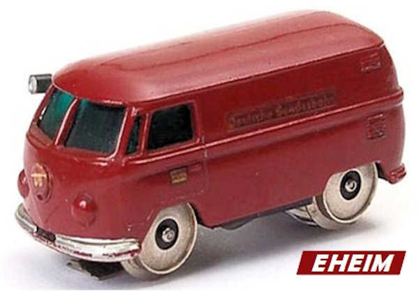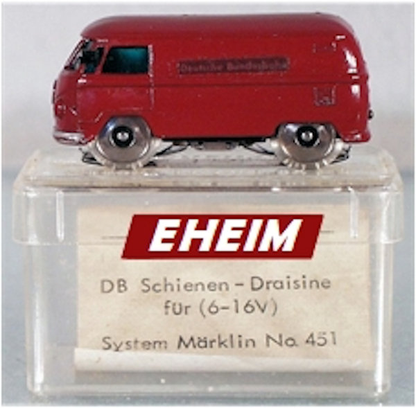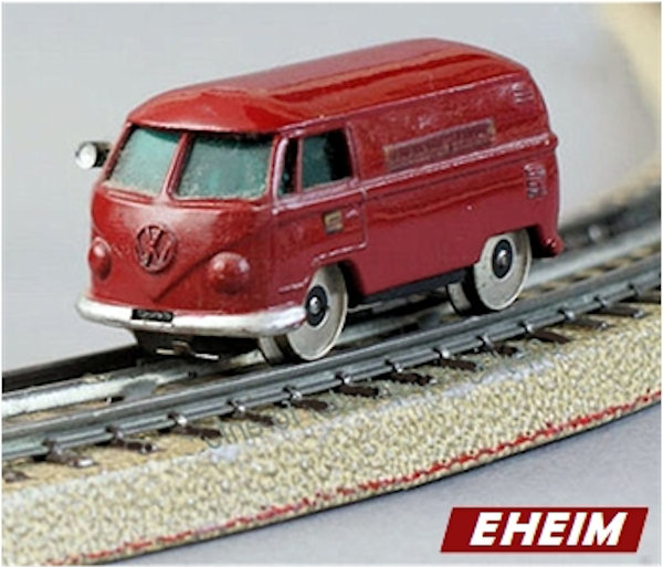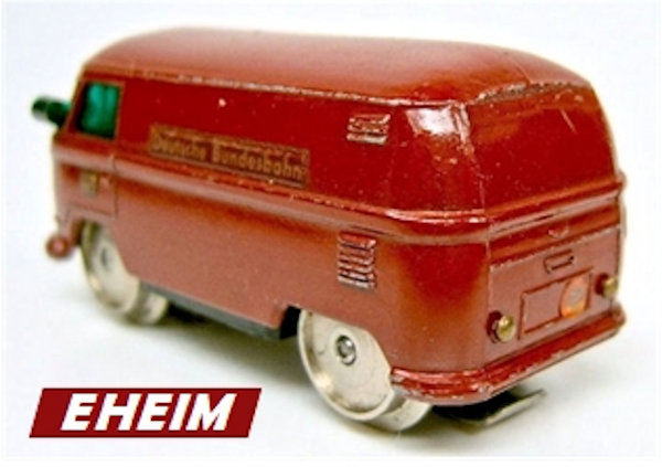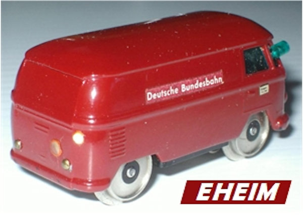 This small EHEIM diecast model was to represent a VW Service Bus for the Deutsche Bundesbahn that was able to run on the train tracks. It was intended for use on the MÄRKLIN & FLEISCHMANN tracks. Basis for this rail VW were the original metal MATCHBOX VW Transporters of the early 60's. Bodies were purchased by EHEIM and converted with motors & rail wheels. When MATCHBOX discontinued the vans (for window kombis), EHEIM purchased the van molds and made very slight changes (VW emblem smoothed to allow for the "DB" Deutsche Bundesbahn emblem on the nose). Very good details for its size which included the VW emblem, headlights, taillights and a front mounted service light. Small electric motor and miniature train wheels powered the VW Bus on HO scale tracks. Painted the Deutsche Bundesbahn burgundy color of the time. There were two types of the EHEIM VW Busses available. Number 451 for the MÄRKLIN 6-16 volts and Number 452 for the FLEISCHMANN 3-12 volts track systems.