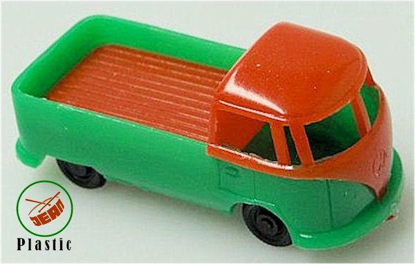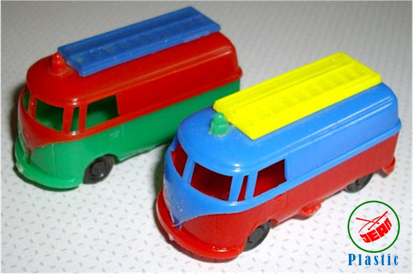 The small scale hard plastic construction JEAN VW T1 Busses came in various configurations such as a Firefighter Bus, Cargo Bus, Transporter, Pick Up Truck with and without hoods. Details included cut out windows and door seams. Black plastic wheels and axles. Chassis has some detailing and is marked DBGM (Deutsches Bundes Gebrauchs Musterschutz) or German Patent.The siren on the Firefighter Bus and the Cargo Bus came in two versions: integrated into the roof or mounted in a drilled hole. They also came with advertising for ERI and NIGRIN (both are shoepolish brands), to mention a few.The advertising was with paper stickers on the toys.