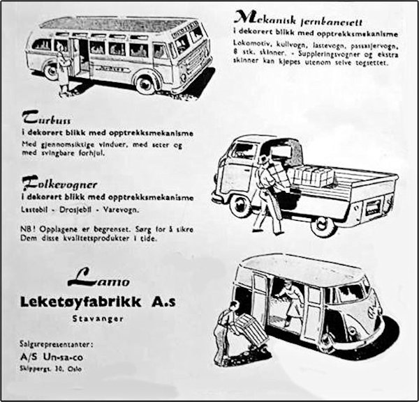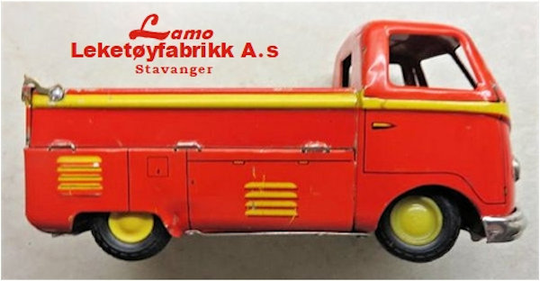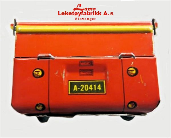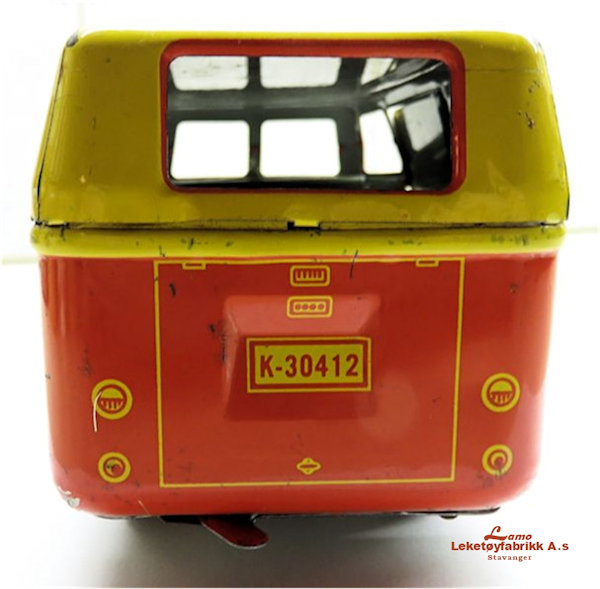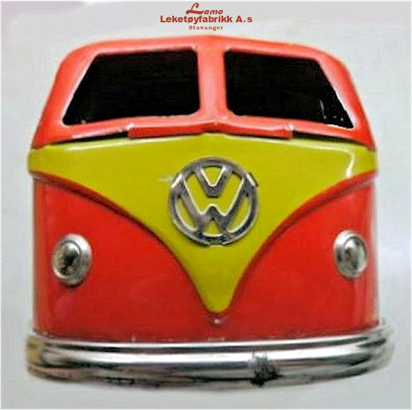 A VW Bus that is made of tin lithograph and is basically a licensed copy of the German GÖSO VW Bus model. This VW Bus was produced by LAMO ( Larsen og Mortensen ), Stavanger, Norway in 1956.
