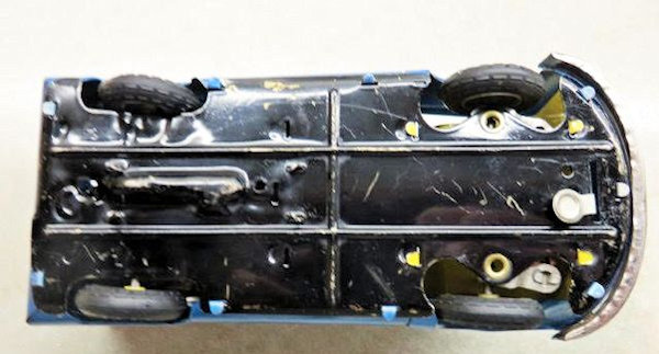 The LAMO VW Busses were produced in two types, a Single Cab and a Panel Van Bus. They have nice body details with colorful lithograph artwork and designs. The Panel Van had only one large door on the side that opened, probably to save manufacturing costs. The Single Cab model had the bed sides that folded down. All the VW Busses are “barn door” style representing a pre-1955 era despite being produced in 1956. The Panel Van Bus came with either with a friction motor or key wound clockwork motor with rubber tires and plastic hubcaps. Both VW Busses had a tin stamped chassis, painted black, with front wheel steering. The Panel Van Bus had a license plate of K-30412 and the Single Cab had A-20414. The Single Cab only came with only a friction motor.