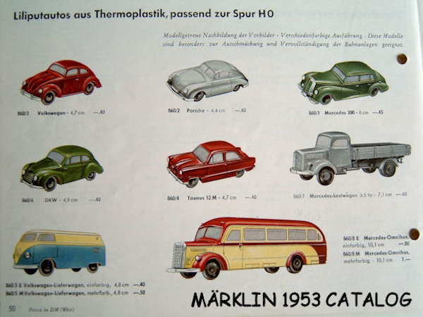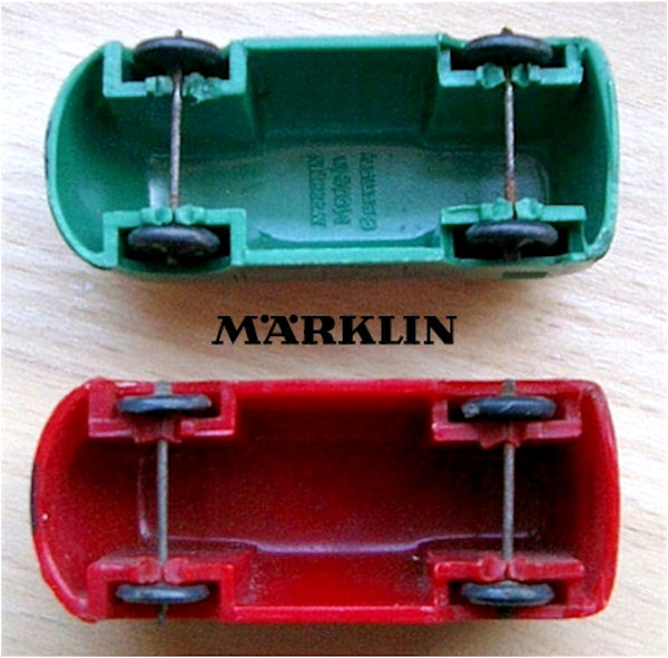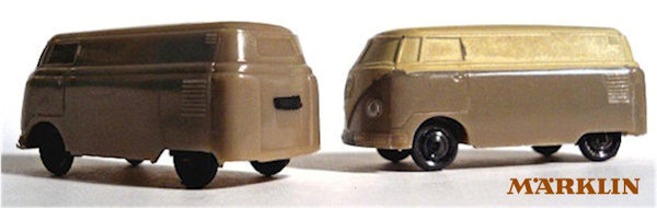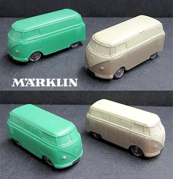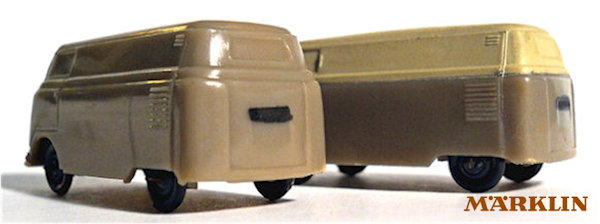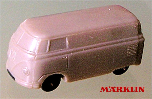 MÄRKLIN introduced their first plastic car models in 1953 in the 'Thermoplastik' or '860' series for accessories to their train sets. Plastic body with solid windows and good details of front VW emblem, door seams, side air louvers and rear "barndoor" engine lid. Body represented the VW Type 2 of 1952/53 without the rear bumper. No chassis and the pin axles with black plastic wheels are melted onto the body. The early version which came in 1953 had no markings; the 1954 versions had MÄRKLIN – MADE IN GERMANY marked on the inside. Some models had a single color and others had the top half painted to create a two-tone color scheme. Some had the windows painted silver as well. MÄRKLIN catalogue No. 860/5.