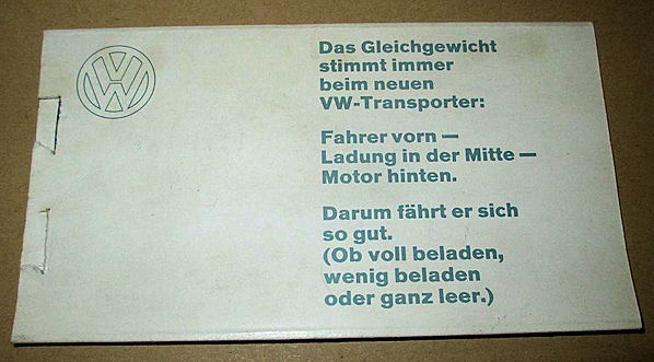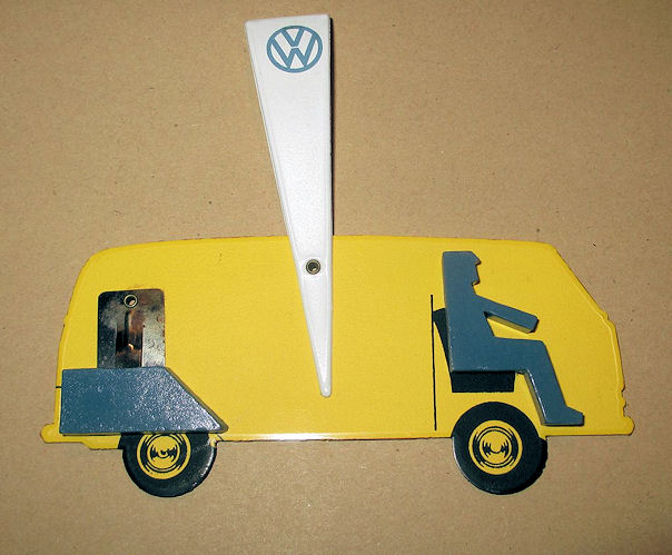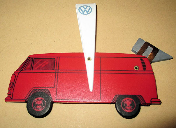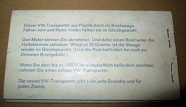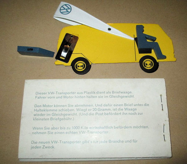 A plastic body in the shape of a T2 VW Panel Bus. It was produced to be used as a postal letter scale. It was a promotional model by VW and was produced by order of the German firm of RENNER. It was meant to shorten the wait for the 1/40 T2a Modell by CURSOR. The letter scale was issued to VW in September 1967 and the CURSOR model was issued in October 1972. In total, 43,500 letter scales were produced by RENNER. The letter scale was manufactured of plastic with some metal parts, being the driver and the “motor”. On one side the red exterior of the VW Bus was shown and on the other side the yellow interior with the driver. A promotional booklet explaining the letter scale was included. It also was used as advertising for the new 1/1 VW T2a. When a letter, measuring 20 grams, was attached to the letter scale instead of the metal “motor”, the letter scale would keep the model straight. In case the driver part would go up, the letter would be heavier than 20 grams and one needed to pay additional postage.