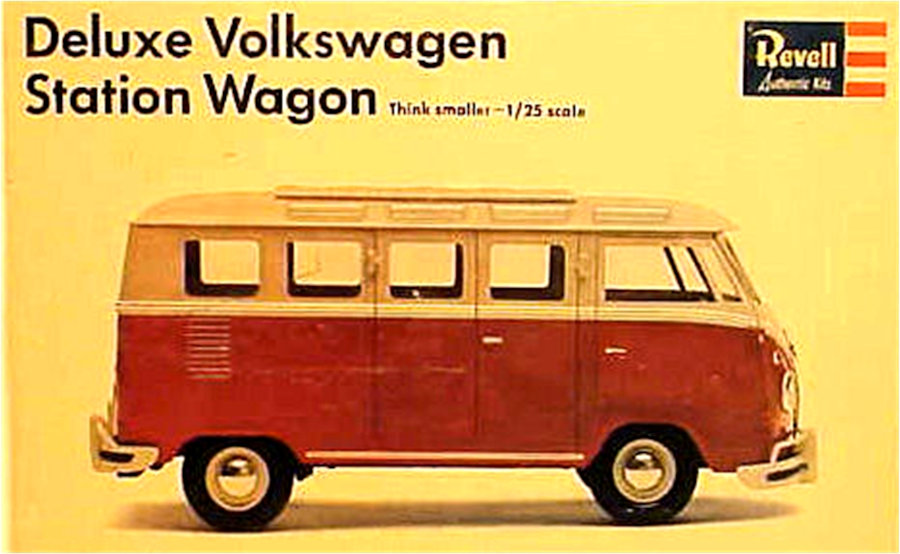 Due to the overwhelming popularity of the VW Bus in the 1960s, REVELL reissued its Microbus model as the DELUXE VOLKSWAGEN STATION WAGON (H-1267). The kit was similar to the 1958 issue (V1), but with details of the 1967 21-window model. The kit featured a detailed engine, undercarriage, running gear, chrome hubcaps on plastic wheels with rubberlike tires and full interior with seats, dashboard, controls and door panels. Body details included hinged doors and engine lid, beltline trim, bumpers, skylight windows, chrome front VW emblem, and the sunroof could be built open or closed. Clear plastic windshields and skylight windows were included, along with a sheet of clear plastic and templates in the instructions for the builder to cut his own windows. This REVELL VW Bus model was later reissued in several variations, but without the passenger Bus details of the originals.