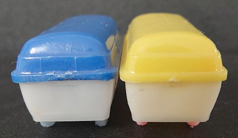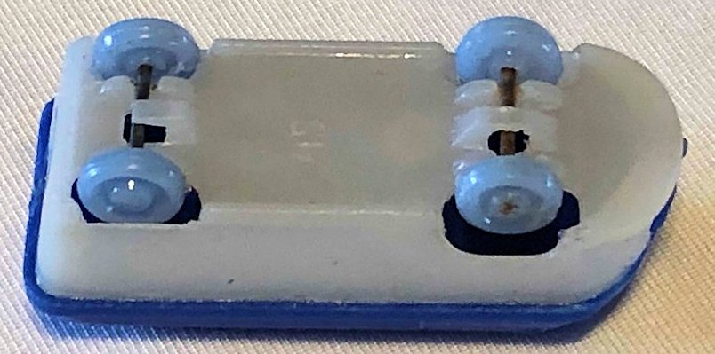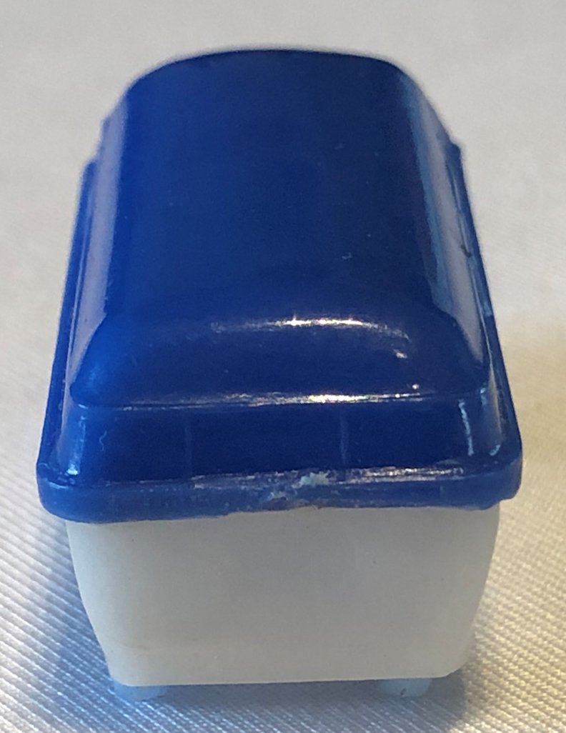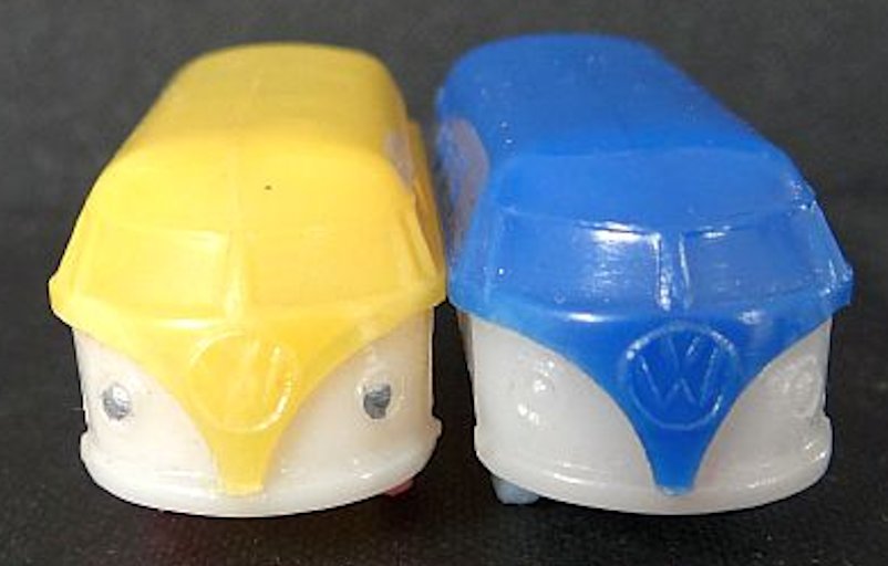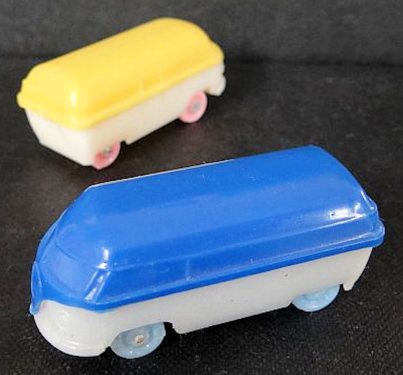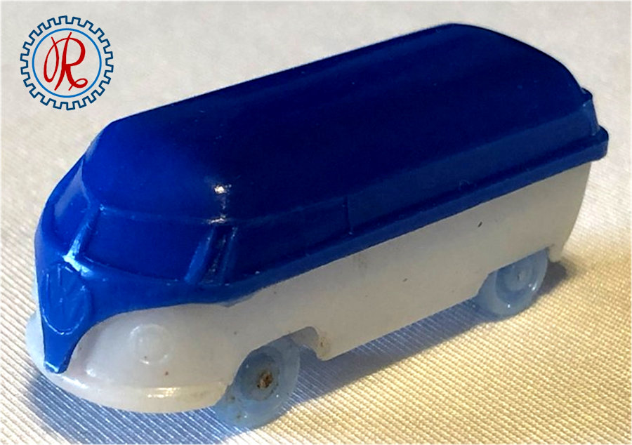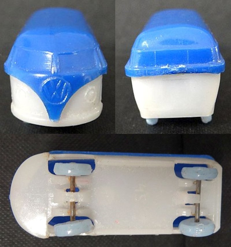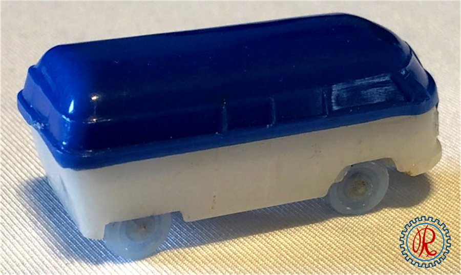 A two-piece plastic VW Kombi Barndoor Bus with solid windows. The top section has fair details of the windshield, four side windows and the enlarged front section VW emblem. The lower section has details of inset headlight circles, some with a dab of silver paint, and front bumper (no rear bumper). The lower section forms the plain looking chassis and the plastic wheels and metal axles attached to the chassis. The chassis usually has molded the number 15.