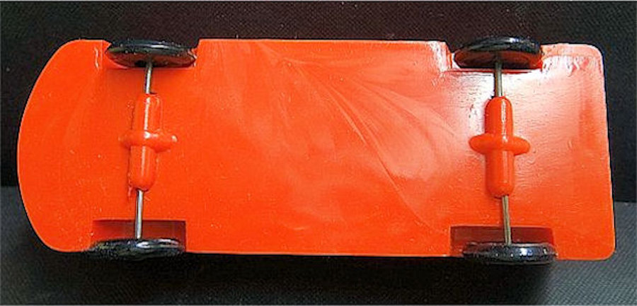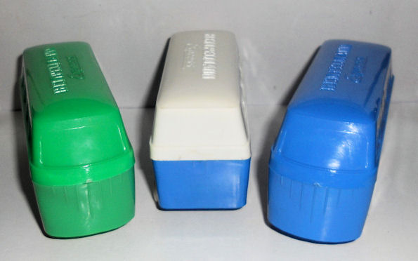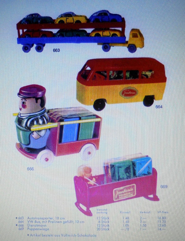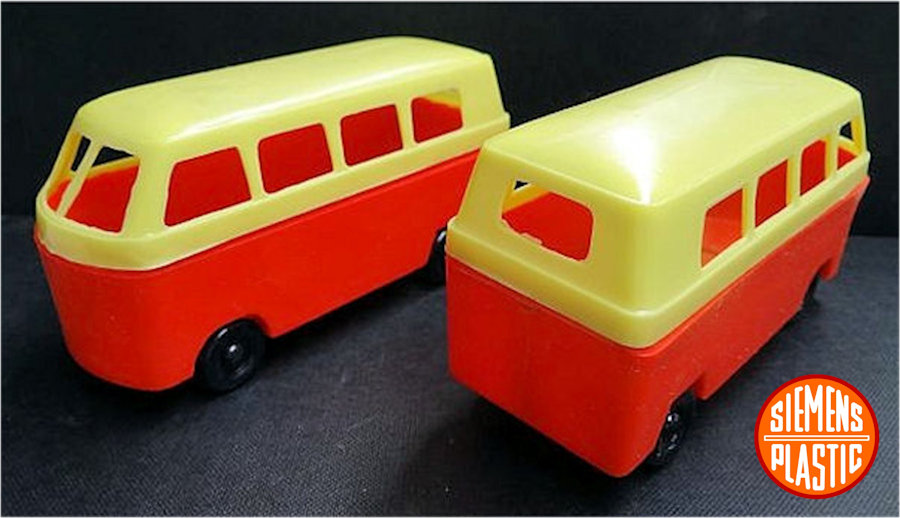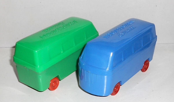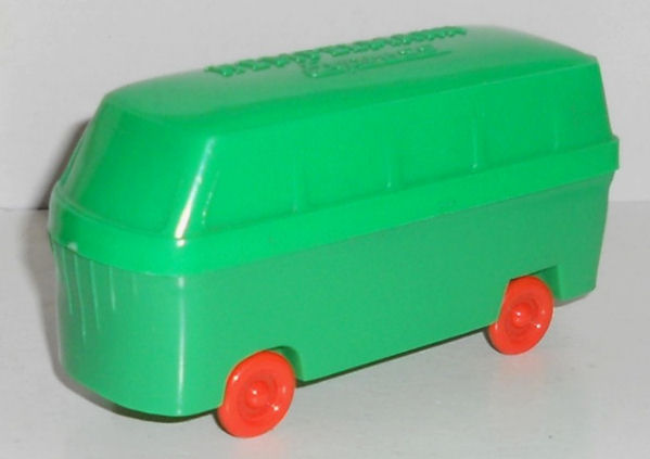 A two piece soft plastic toy in the shape of a VW Transporter or Passenger Bus. Top section made with or without cut out windows. The lower body section forms the chassis with black plastic wheels on metal axles. These toys were not primarily intended as toys, but intended to be filled with candy or other products; we also have seen tobacco!