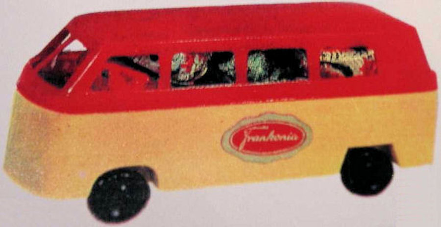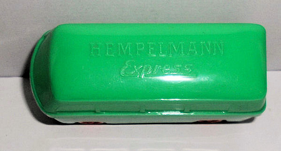 SIEMENS has presented their products at a fair in Vienna, Austria named WIM (Wiener Internationaler Messe). For that occasion they had produced boxes with 3 VW Busses in it and a sticker with the WIM logo on it. Those boxes regularly surface, so therefore, many collectors believed that WIM was an Austrian producer of the toys. The buyers had the choice between several color combinations: two-tone with black wheels. The open window version most probably was meant for candy or chocolate, whereas the closed version was used for products like tobacco. We have seen stickers of Frankonia (chocolates) and writings on top of the roof with Hempelmann Express (tobacco). The Hempelmann express has the writing "50 gr Feinschnitt" on the chassis, meaning that it contains 50 gr of fine tobacco product.